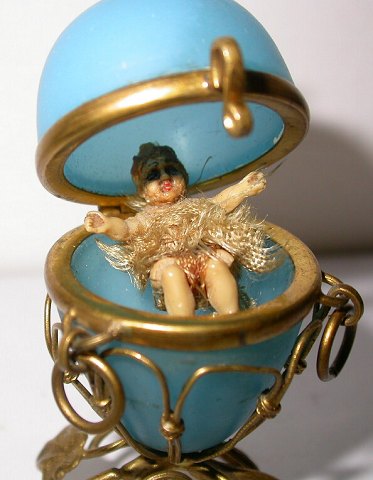 Small blue opal glass egg in metal holder. A little surprice inside - a small doll. 7 cm high .