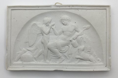 Royal Copenhagen Bisque Plate Amor at Bacchus No 66. Copy from 1847 by Th. Mule after Thorvaldsens original from Rom after 1910. Measures 15cm x 9cm. Has numerous chips, as can be seen on the picture. Four chip on four sides !