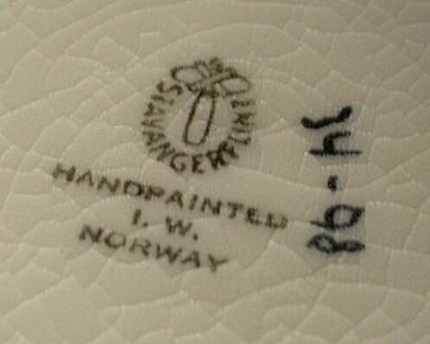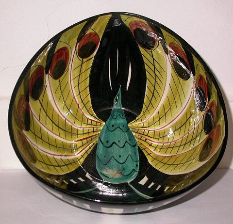 Skål i faiance fra Stavangerflint i Norge. Designet af Inger Waage. Dekoreret med farverigt motiv af påfugl. I perfekt stand. Fabriksmærket på bunden sammen med kunstner initialer I. W. 12½ cm høj og 22 cm i diameter.