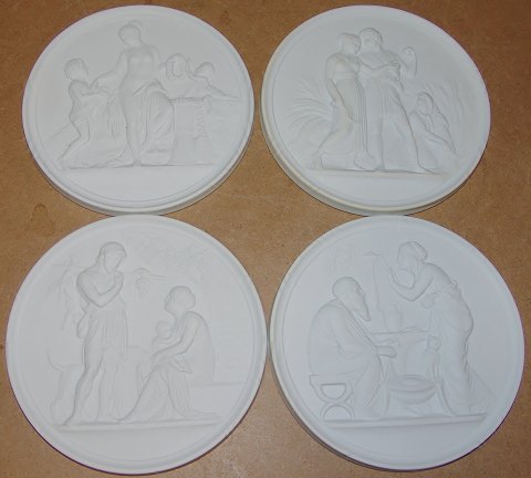 Set of Bing & Grøndahl Bisque Plates Spring, Summer, Fall and Winter No 116, No 117, No 118, No 119. Copy from Thorvaldsens original from Rom 1836. Measures 14,5cm. New edition.