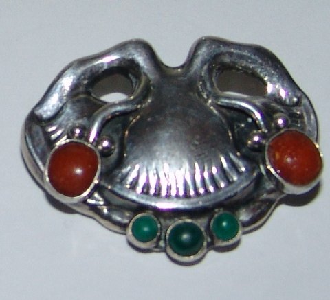 Tidlig 1904-1908 Georg Jensen Sølv Broche No 29. Måler 4,1cm og er i god stand. Men den ene røde sten har afslag. Vi kan godt levere den med hel sten, men det er op til den nye ejer at vælge det.