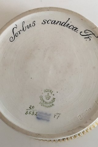 Antik Royal Copenhagen Flora Danica Frugtskål No 3532. Måler 18,5cm og er i perfekt stand. Med ældre dato mærker og har den gamle glasur of flotte grønne farve. Sjælden set gammel frugtkurv. Latinsk navn "Sorbus scandica Fr."