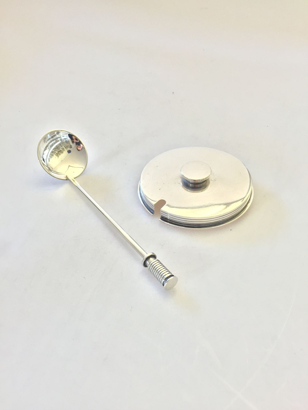 Georg Jensen Sterling Sølv Låg og ske af Sigvard Bernadotte No 510 og No 14. Låg måler 8,1cm og ske 14,5cm og er i perfekt stand.