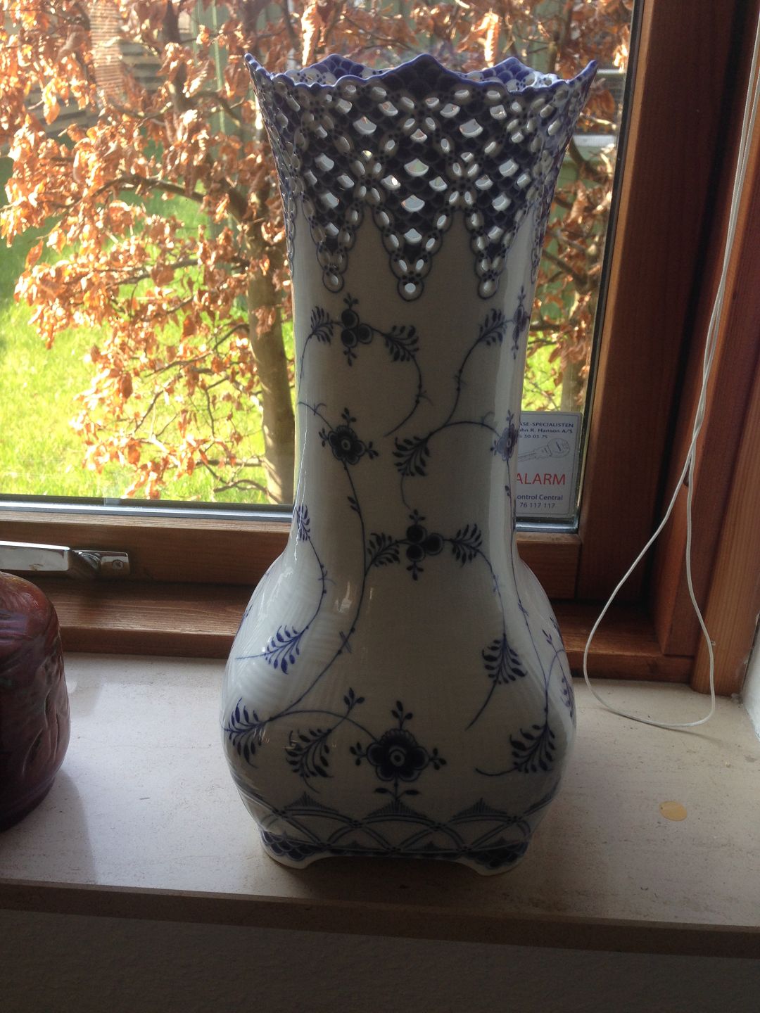 Royal Copenhagen Helblonde Musselmalet stor Vase No 1166. Måler 37,5cm og er i god stand, udover den har en hårrevne, se billede. Vi har en der er perfekt i en anden listing. Er fra pre 1923.