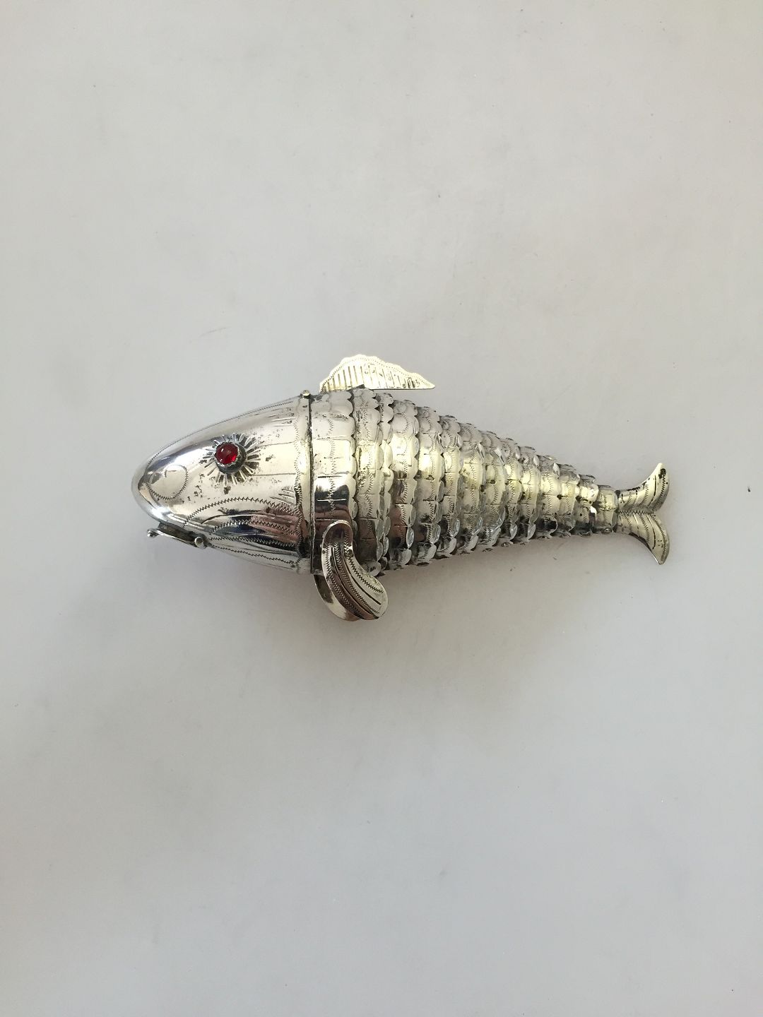 Hovedvandsæg af Fritz Sophus Albertus (1877-1950) udformet som en skidtfisk med to røde flusser. Måler 11 cm og vejer 40 g.