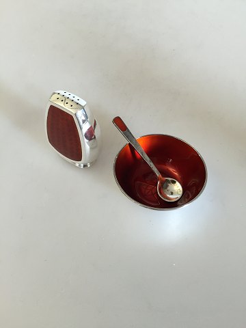 Anton Michelsen Salt & Pebersæt i Sterling Sølv med rød emalje. Samlet vægt 48 g. Peberbøsse måler 5 cm i højden. Saltskålens diameter måler 5 cm. Fremstår i fin stand.