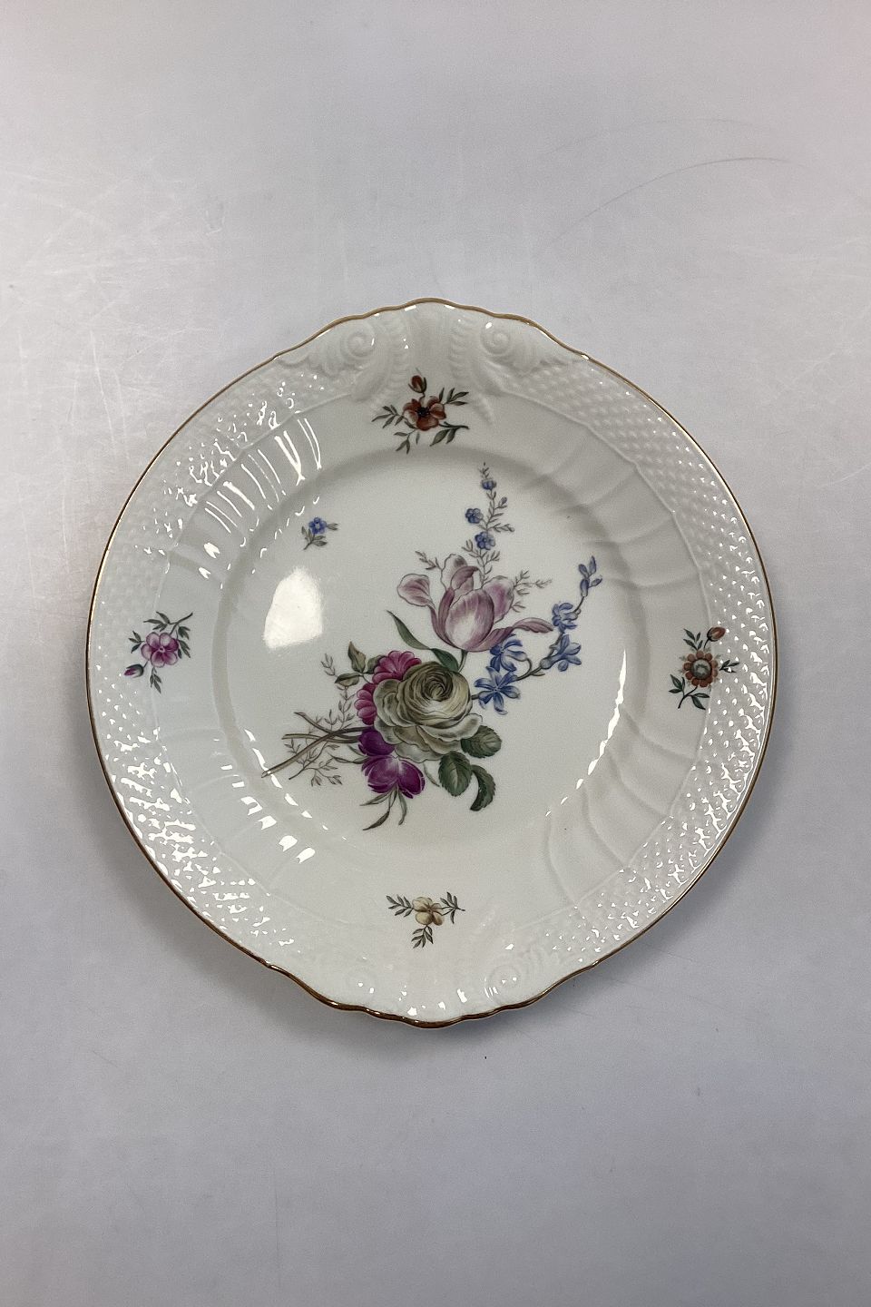 Royal Copenhagen Frijsenborg Round Cake Tray No. 1864. Measures 27 cm (10 3/5"). Creme colored with flower motifs named after the Danish Estate of Frijsenborg.