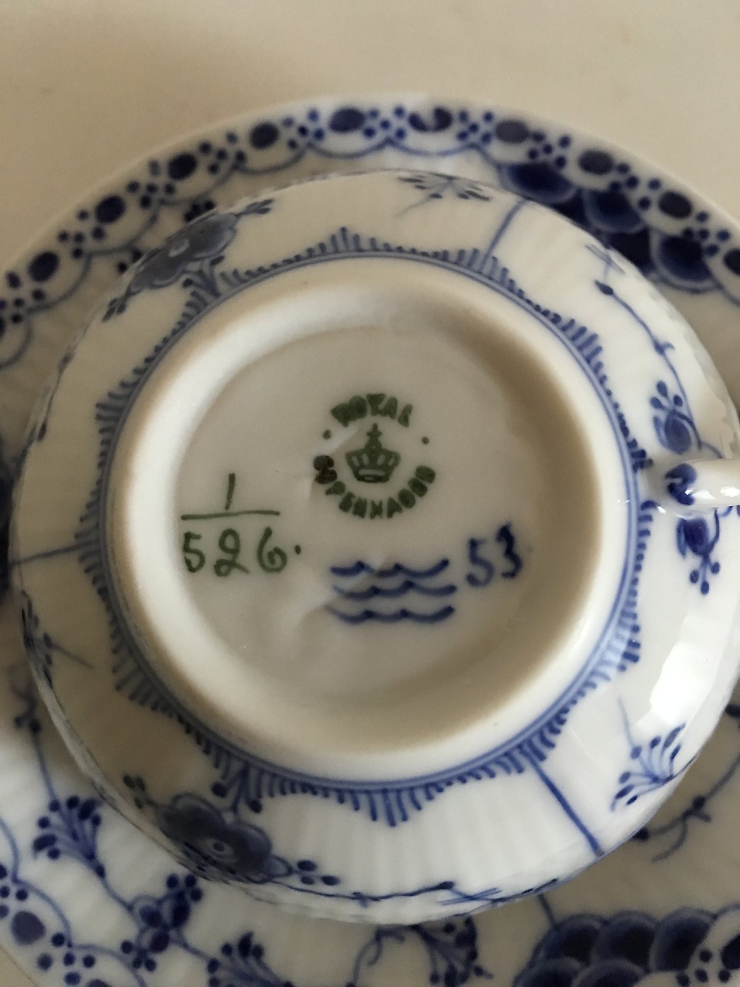 Royal Copenhagen Blue Fluted Half Lace Coffee Cup and Saucer No 526. Cup measures 8 cm dia (3 5/32") and 3.5 cm H (1 3/8")