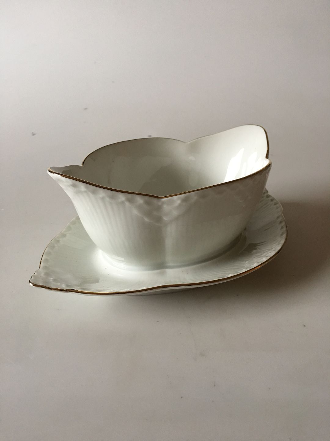Royal Copenhagen Tradition White Half Lace w. Gold Sauce Bowl No 1275/587. The Sauce container itself measures 9 cm H (3 35/64") 19.5 cm L (7 43/64"). In perfect condition.