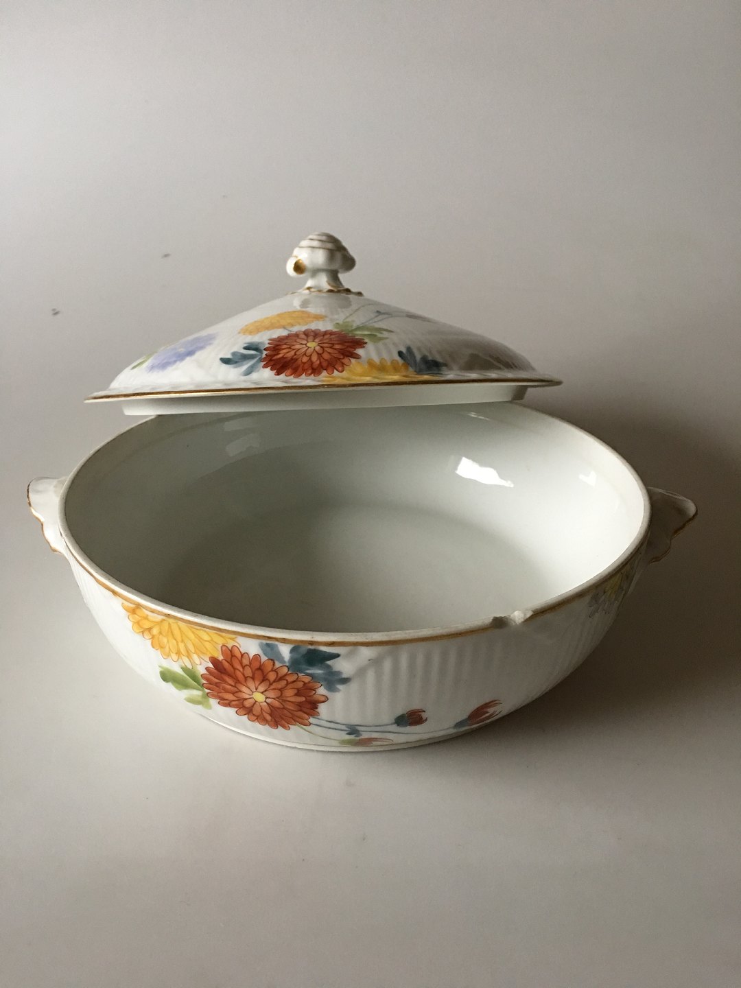 Royal Copenhagen No 93 White Half Lace Lidded Serving Dish w. Flowers and Gold. 20 cm dia (7 7/8"). 6 cm H (2 23/64"). The lid and the bowl is chipped, look at pictures. The gold has some wear to it. Rare dinner service from 1894-1898. Handpainted.