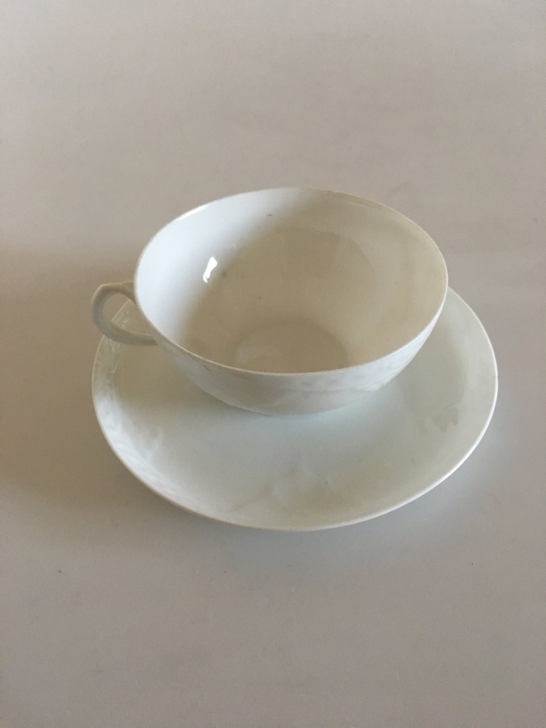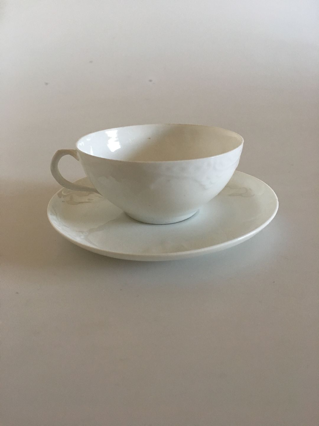 Royal Copenhagen White Ba Coffee Cup and Saucer. Measures 8 cm dia. 4 cm H. In nice whole condition. There are a few greyish spots / burning mistakes in the white porcelain. Appears well