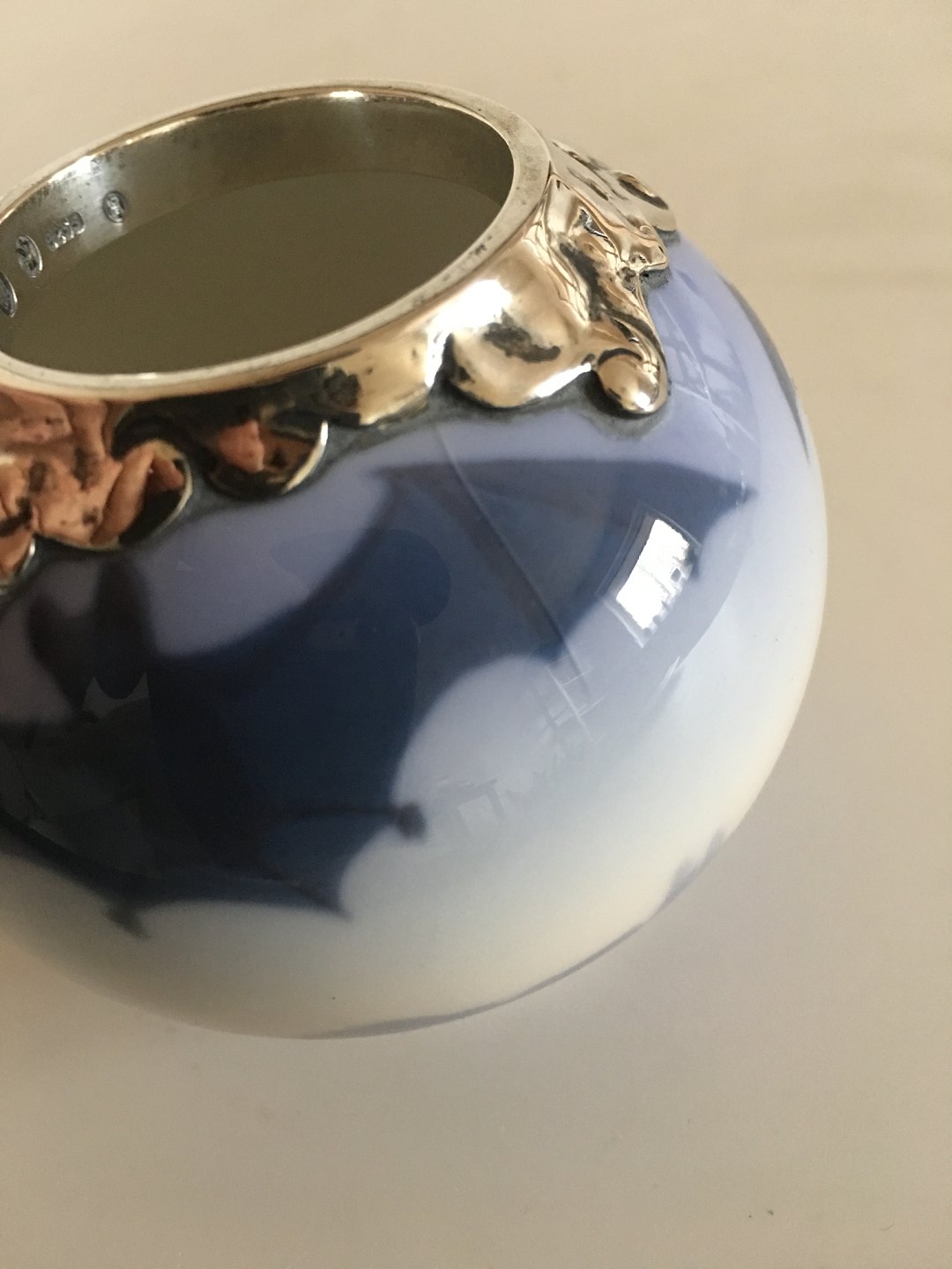 Royal Copenhagen Art Nouveau Vase No 225/42A with Bat Motif and A. Michelsen Silver Mounted Piece. The vase has a small hairline chip (look at picture), otherwise in nice condition. 6.5 cm H (2 9/16").