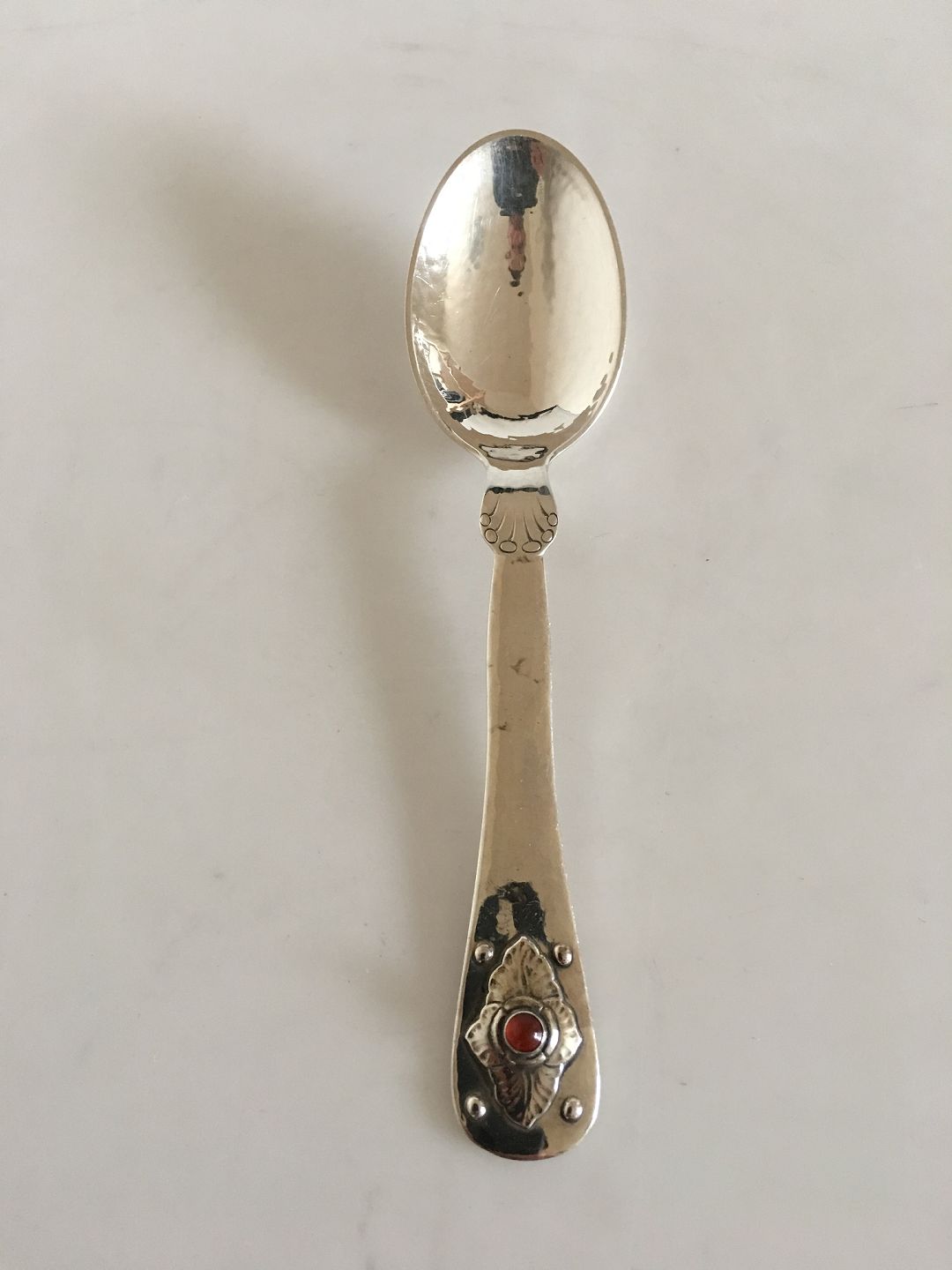 Georg Jensen Sterling Silver 75 Year Jubilee Child Spoon with Carnelian Stone. Measures 15.2 cm L (5 5 63/64")