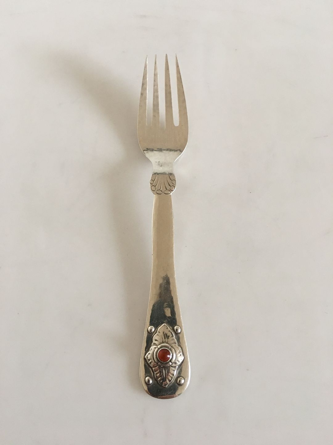 Georg Jensen Sterling Sølv 75 Års Jubilæums Barnegaffel med Carneol Sten. 15.2 cm L. Produceret i 1979.