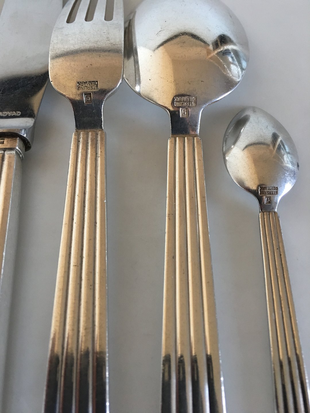 Georg Jensen Sterling Sølv Bernadotte Bestik Sæt til 12 Pers. Alle dele med GJ stempler fra 1933-1945. Sættet består af følgende dele;