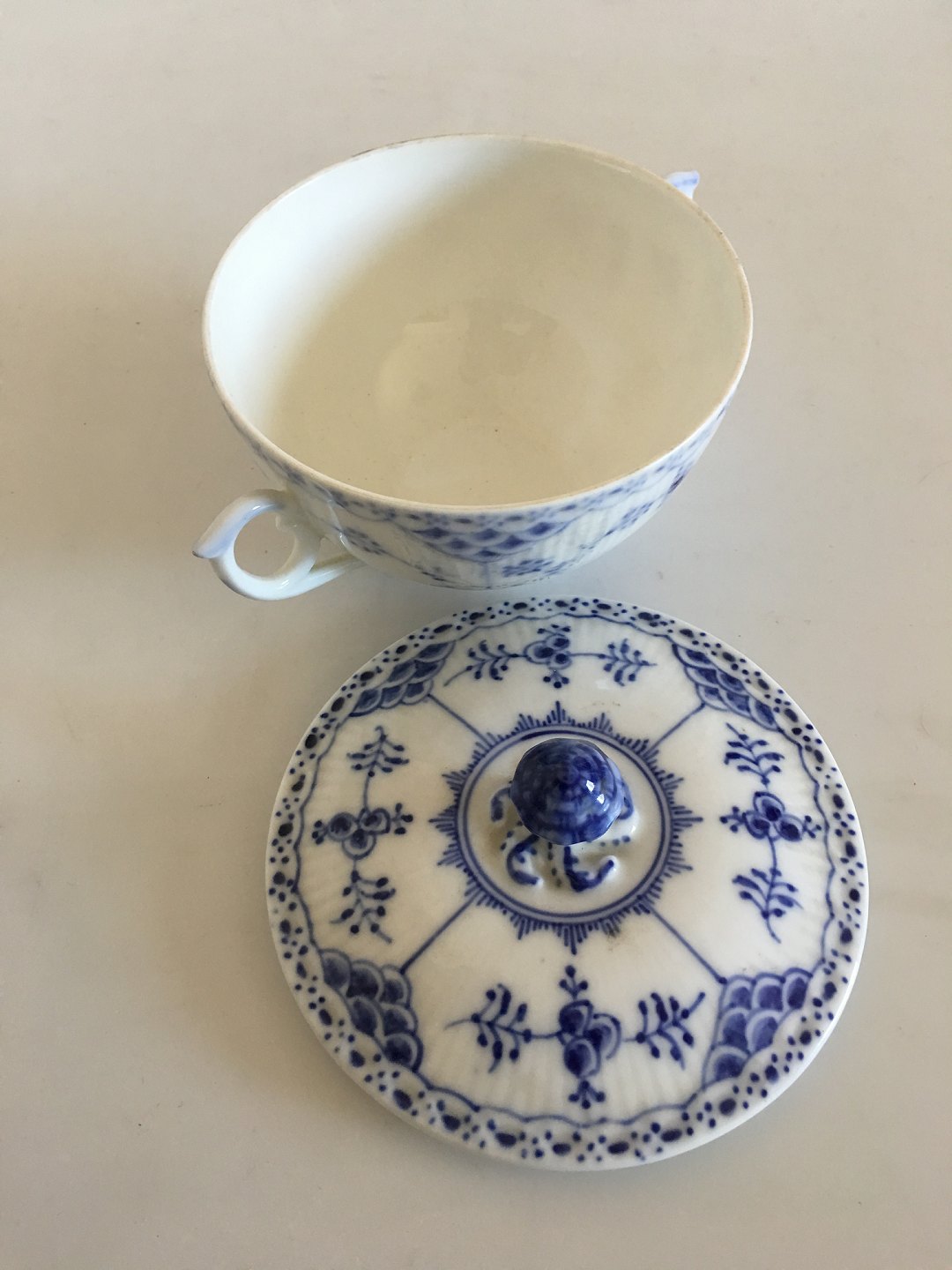 Royal Copenhagen Musselmalet Halvblonde Bouillon Kop med Låg No 764. 2. Sortering. Underdelen er er lidt mat i farven, ellers i fin hel stand.
