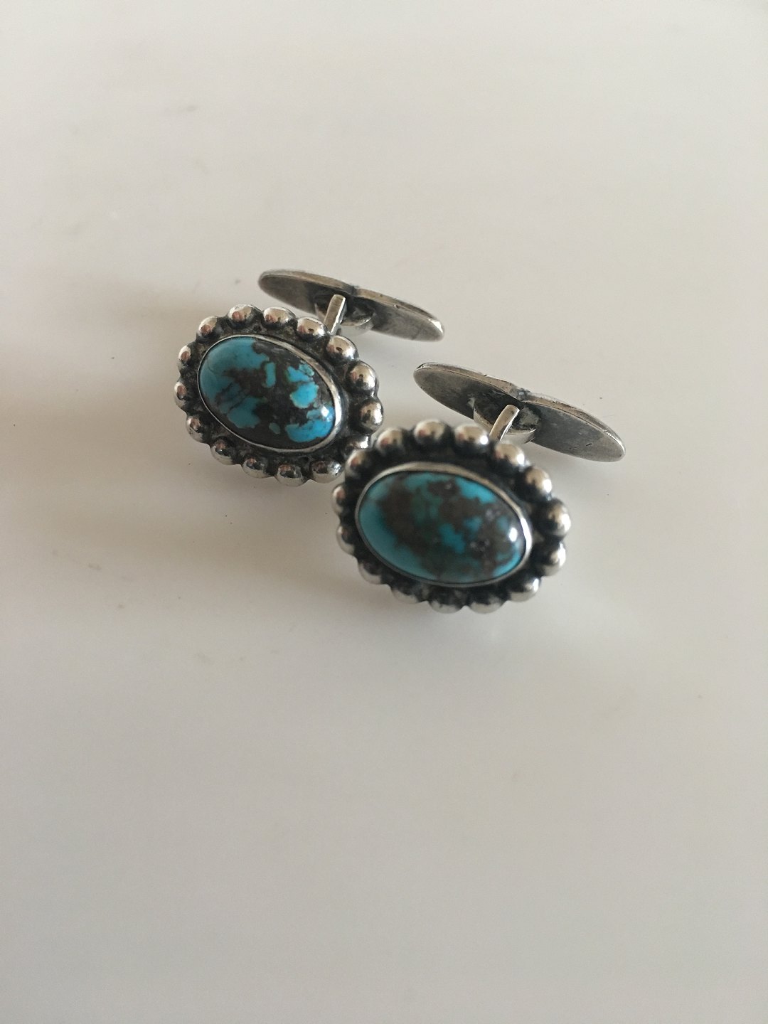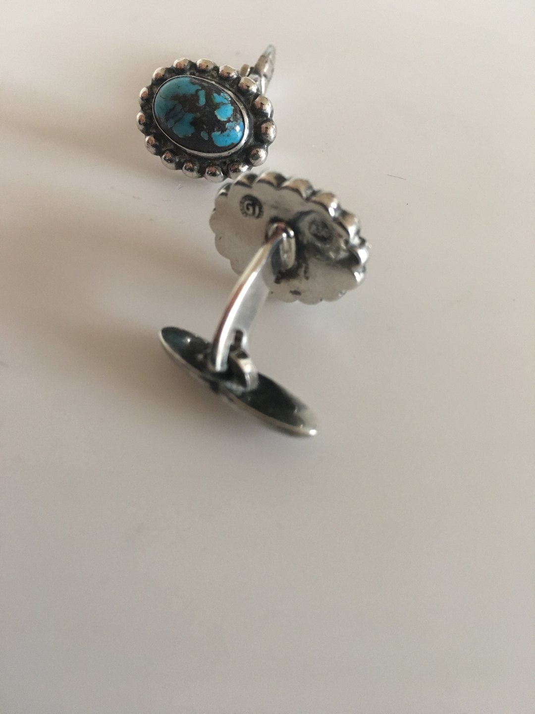 Georg Jensen Sølv Manchetknapper No 26 med Turkis Sten. Med gamle Georg Jensen Stempler fra start 1920'erne. 1.6 cm Ø. Vejer 14 gram. I fin stand