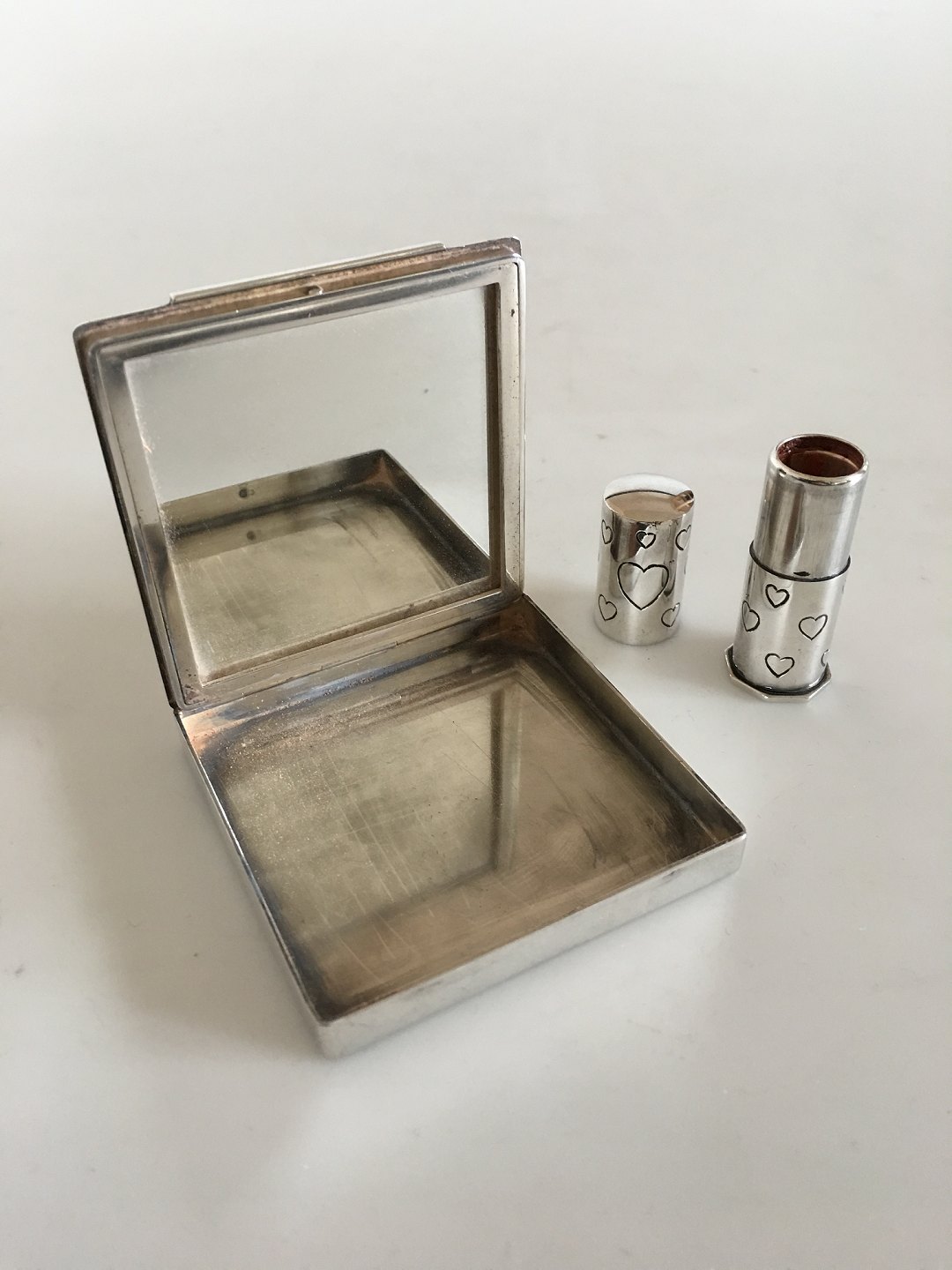 Pudder og Spejl Etui samt Læbestift Holder I Sølv pyntet med Hjerter. Uden sølvstempler men er i sin tid blevet købt hos Hans Hansen. I fin stand. Pudderetui 6.5 x 6.5 x 0.8 cm. Læbestiftholder 5 cm L.