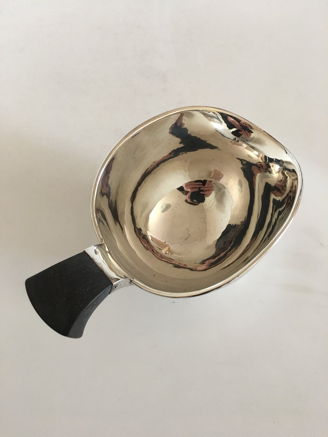 Aage Weimar Lille Saucekande i Sølv med Træhank. 7 cm H. 11.5 cm Ø. Vejer 191 gram. I pæn stand.