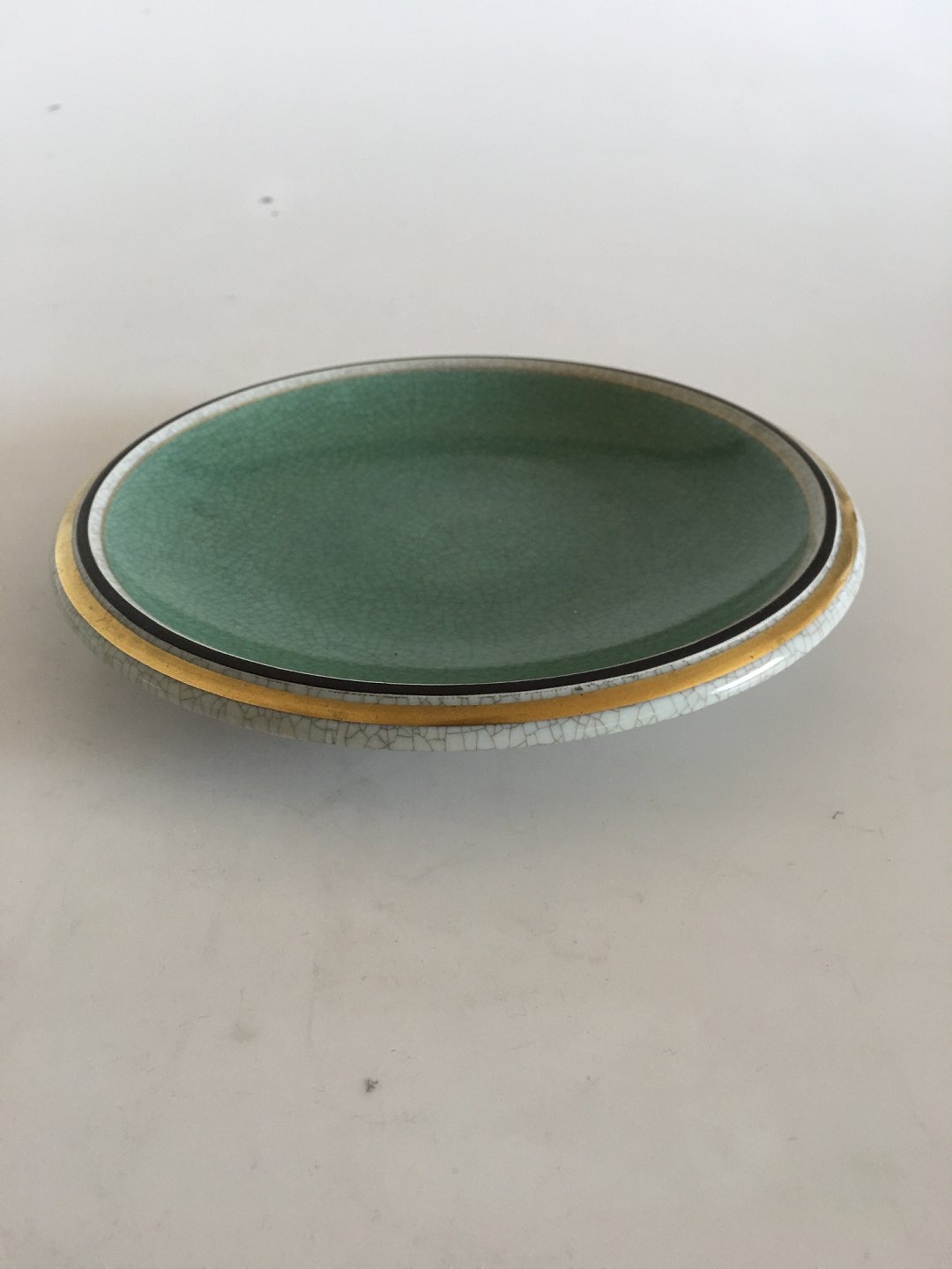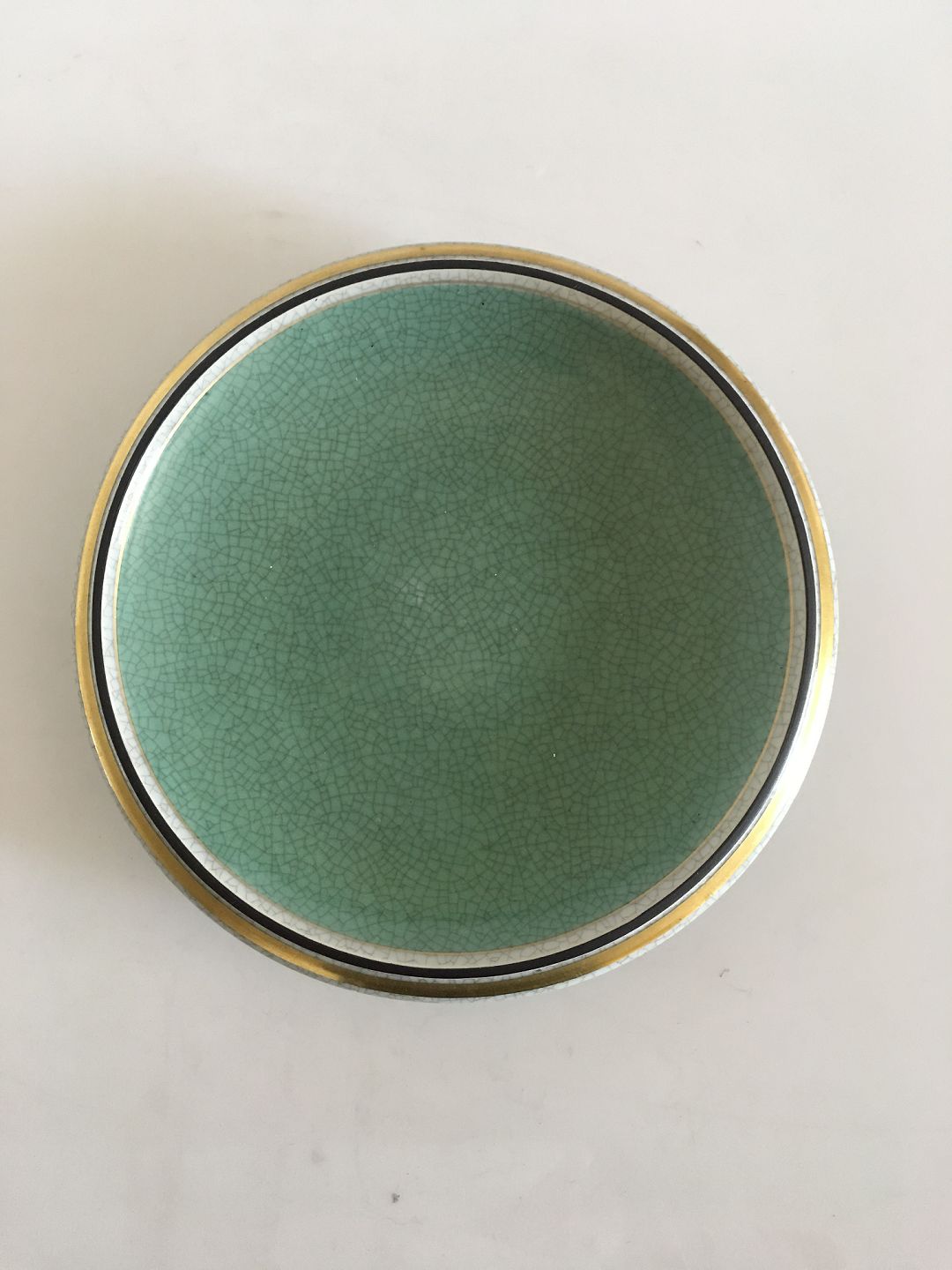 Royal Copenhagen Crackle Dish No 457/2568. Mint Green with Black and Gold Striped Border. 18 cm dia (7 3/32"). 1st quality. In excellent condition.