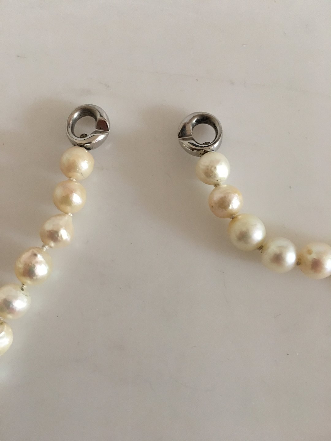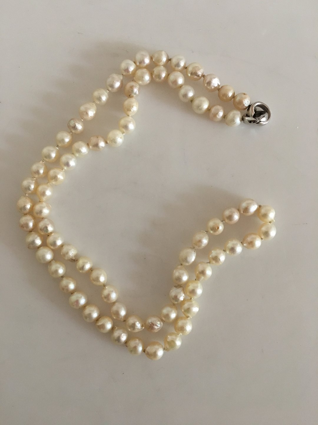 Georg Jensen Perlehalskæde med Lås af Hvidguld. Kæden er 63 cm L. Perlerne måler 0.6 mm. Vejer 49 gram. I god stand.