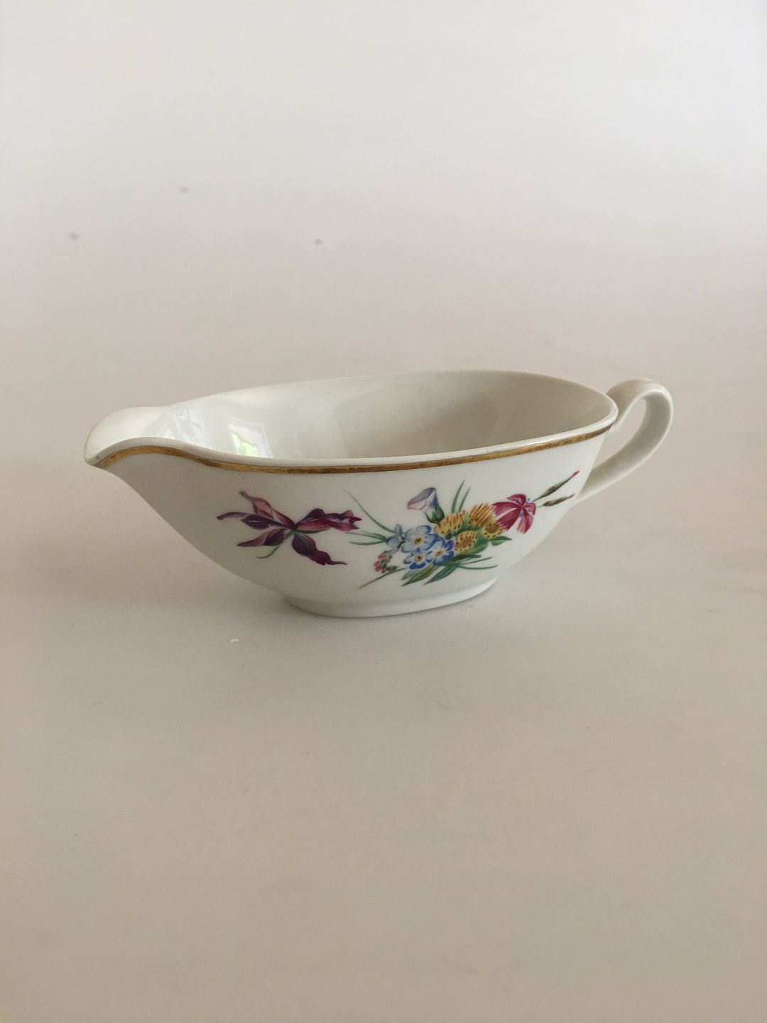 Royal Copenhagen Primavera Thorkild Olsen Butter Creamer No 1515/14028. White service with flower dekoration and gold band. The creamer measures 4.2 cm H. 11.5 cm dia.
