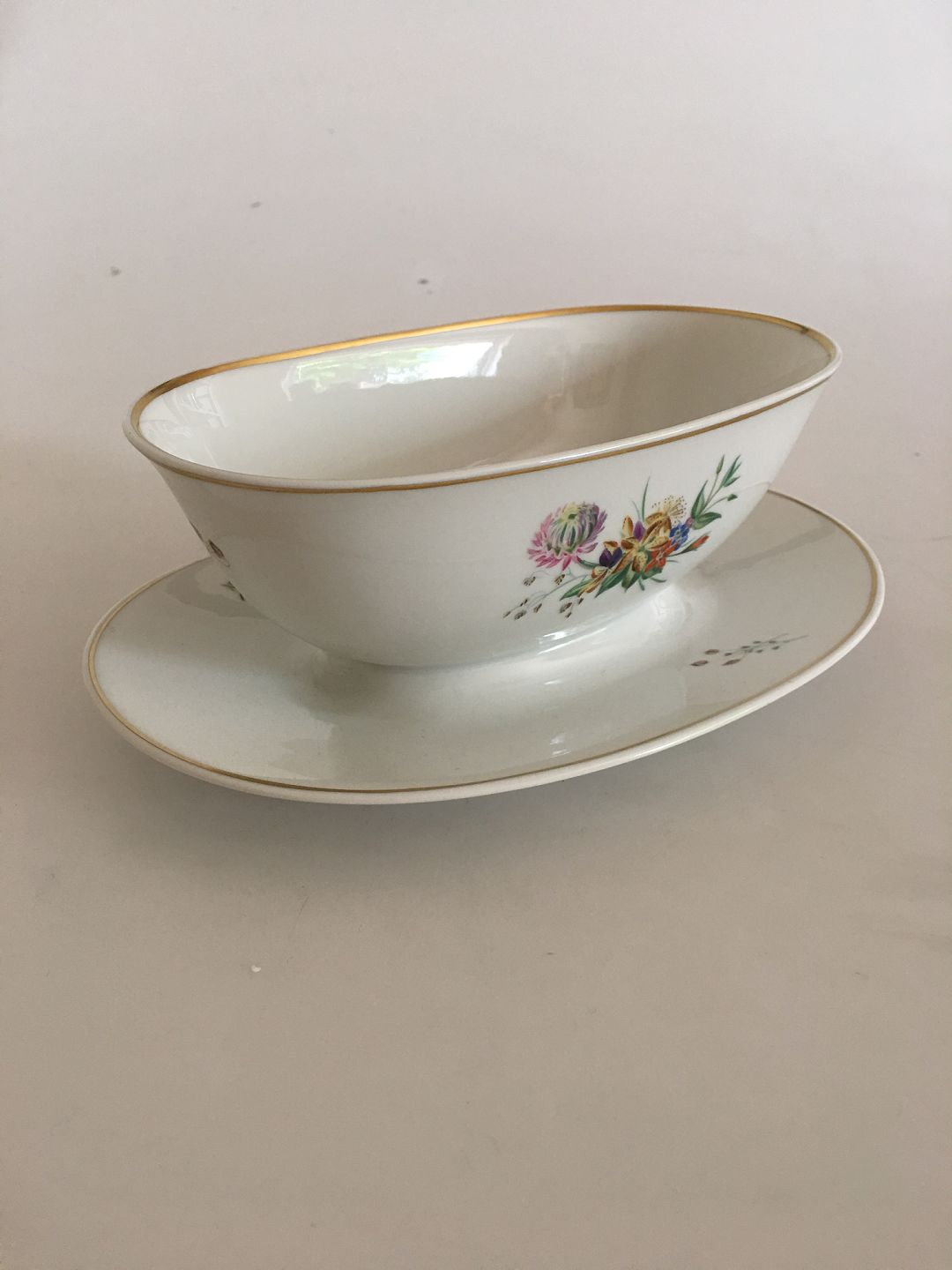Royal Copenhagen Primavera Thorkild Olsen Sauceskål No 1515/14003. Hvidt stel med blomsterdekoration og guldkant. Skålen er 8 cm H. 18 x 10 cm dia.