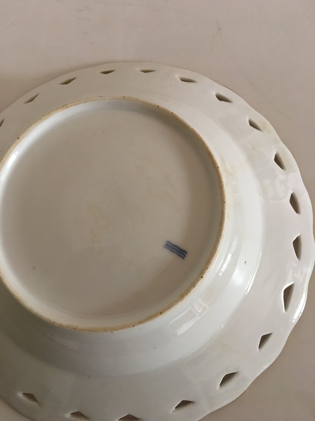 Royal Copenhagen Full Saxon Flower Deep Plate with Pierced Lace Border from 1860-1890. 22.5 cm dia (8 55/64"). In nice condition, with No to minimal wear on the gold.