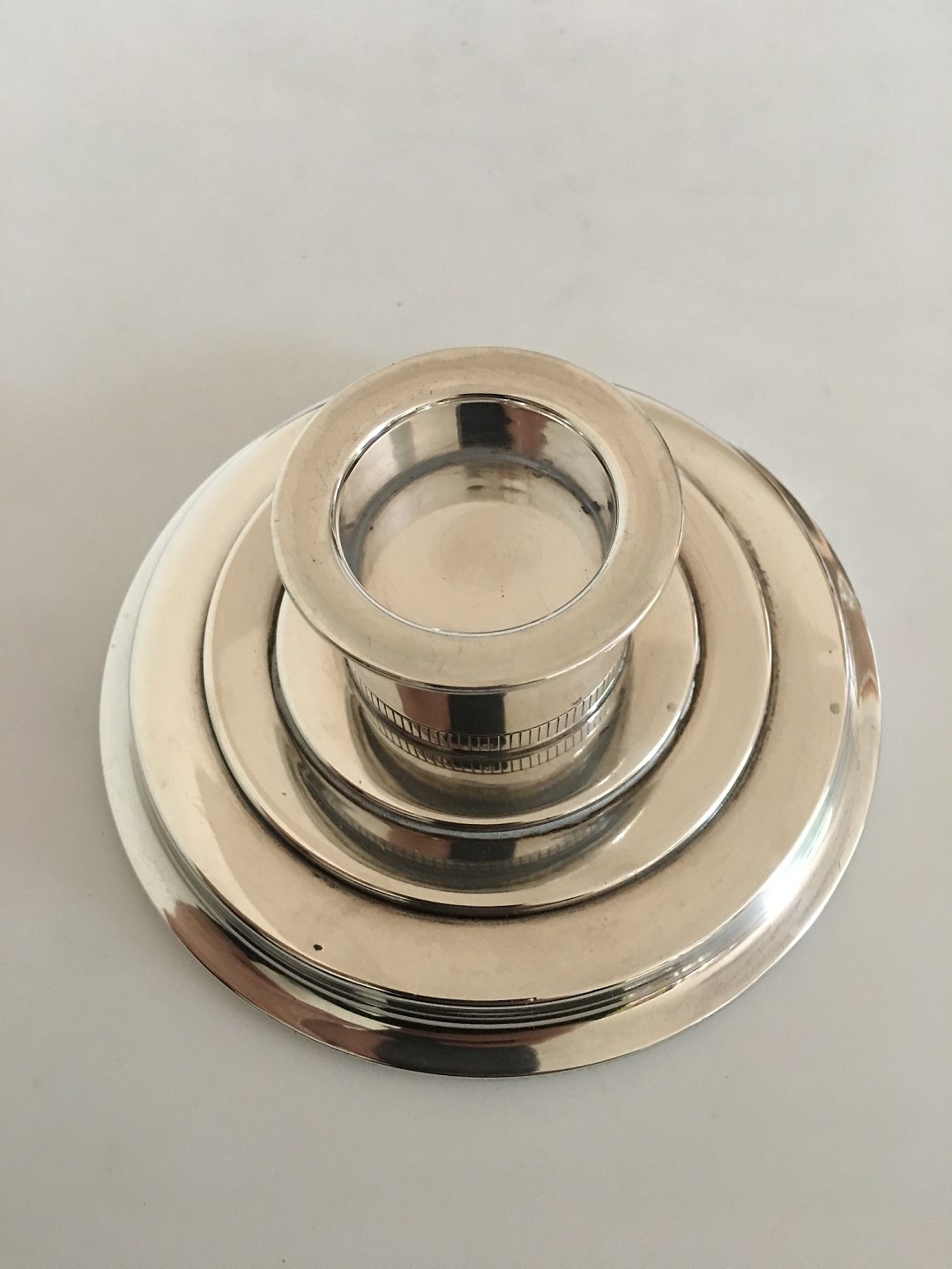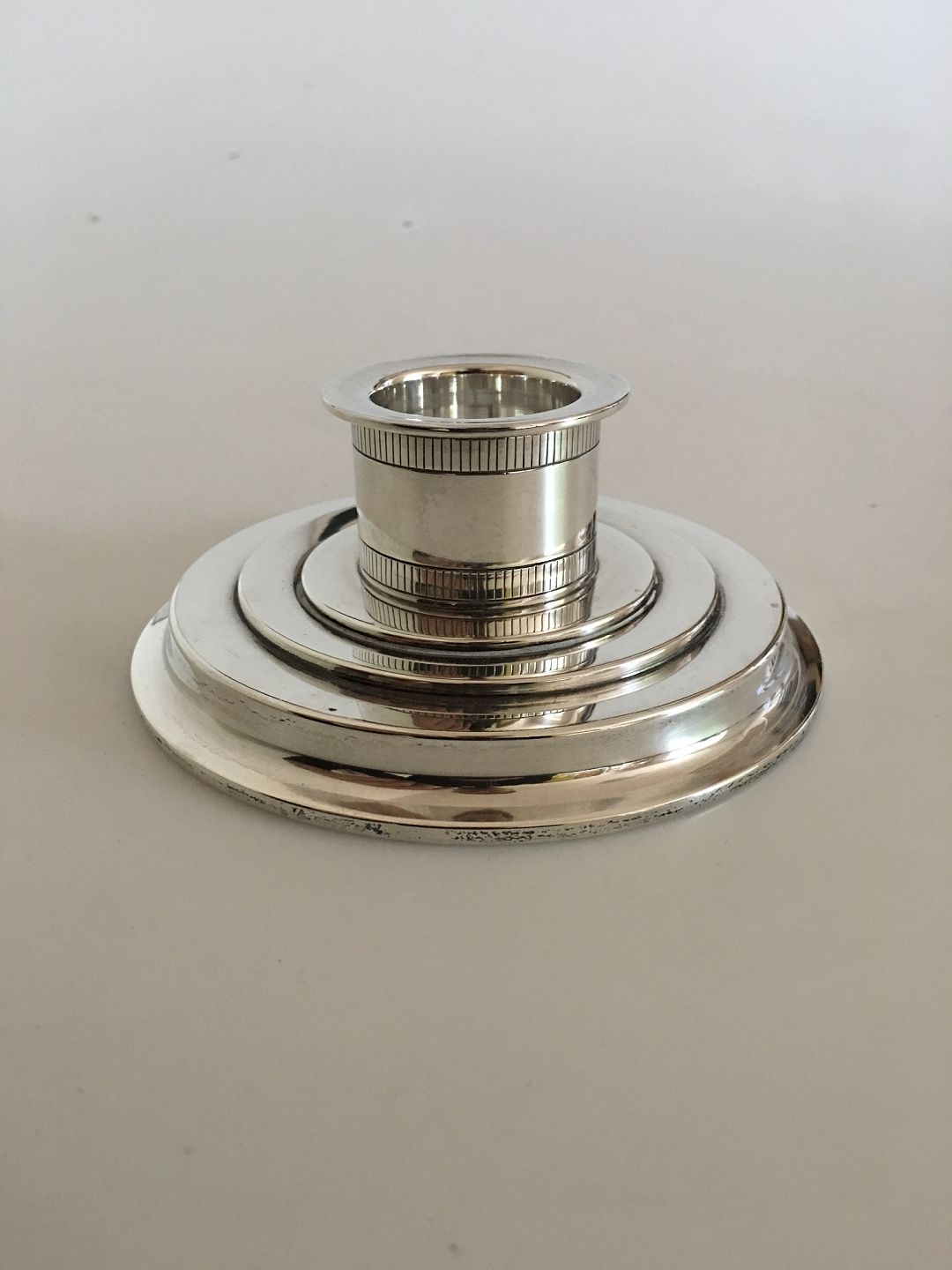 Just Andersen Sterling Sølv Lysestage No. 2122. 5.5 cm Høj. 13 cm dia. Passer til et lys med en diameter på små 4 cm. Vejer 197 gram.