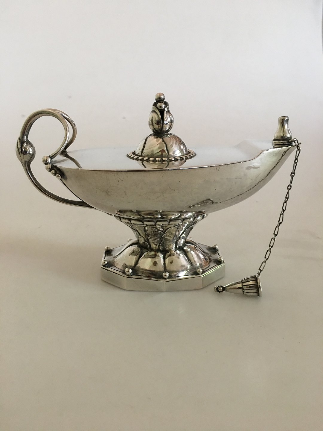 Georg Jensen Sterling Sølv Olielampe No. 12. Lampen er fra 1915-1930. 9 cm Høj, 13.5 cm L. Vejer 168 gram. I fin stand.
