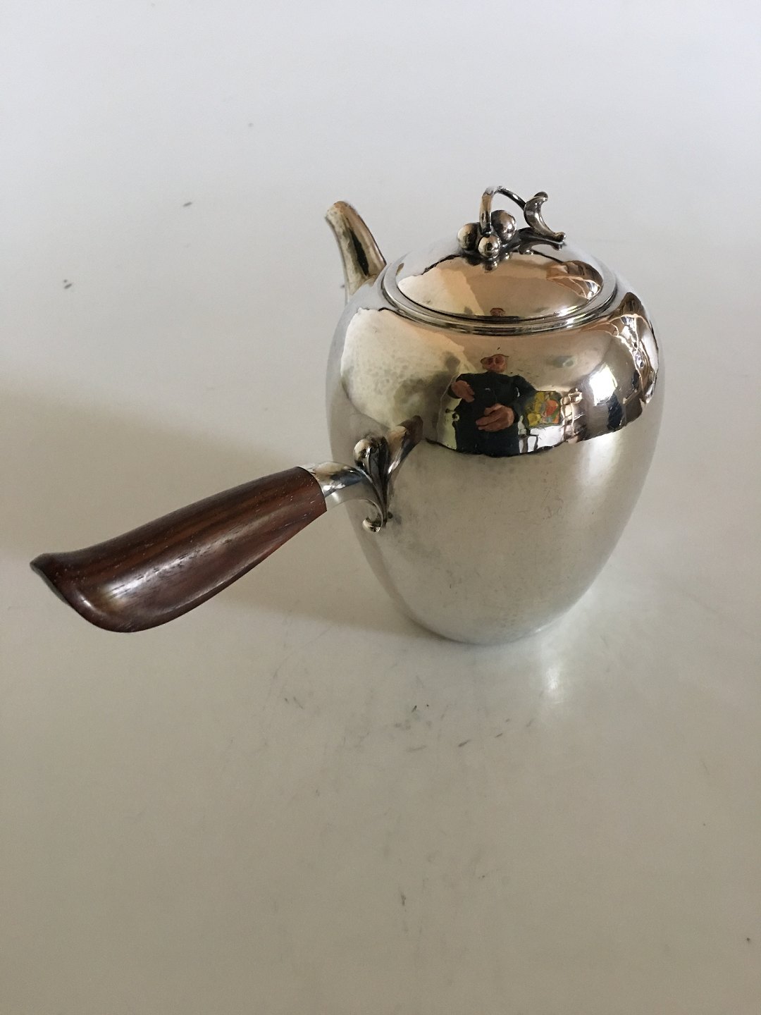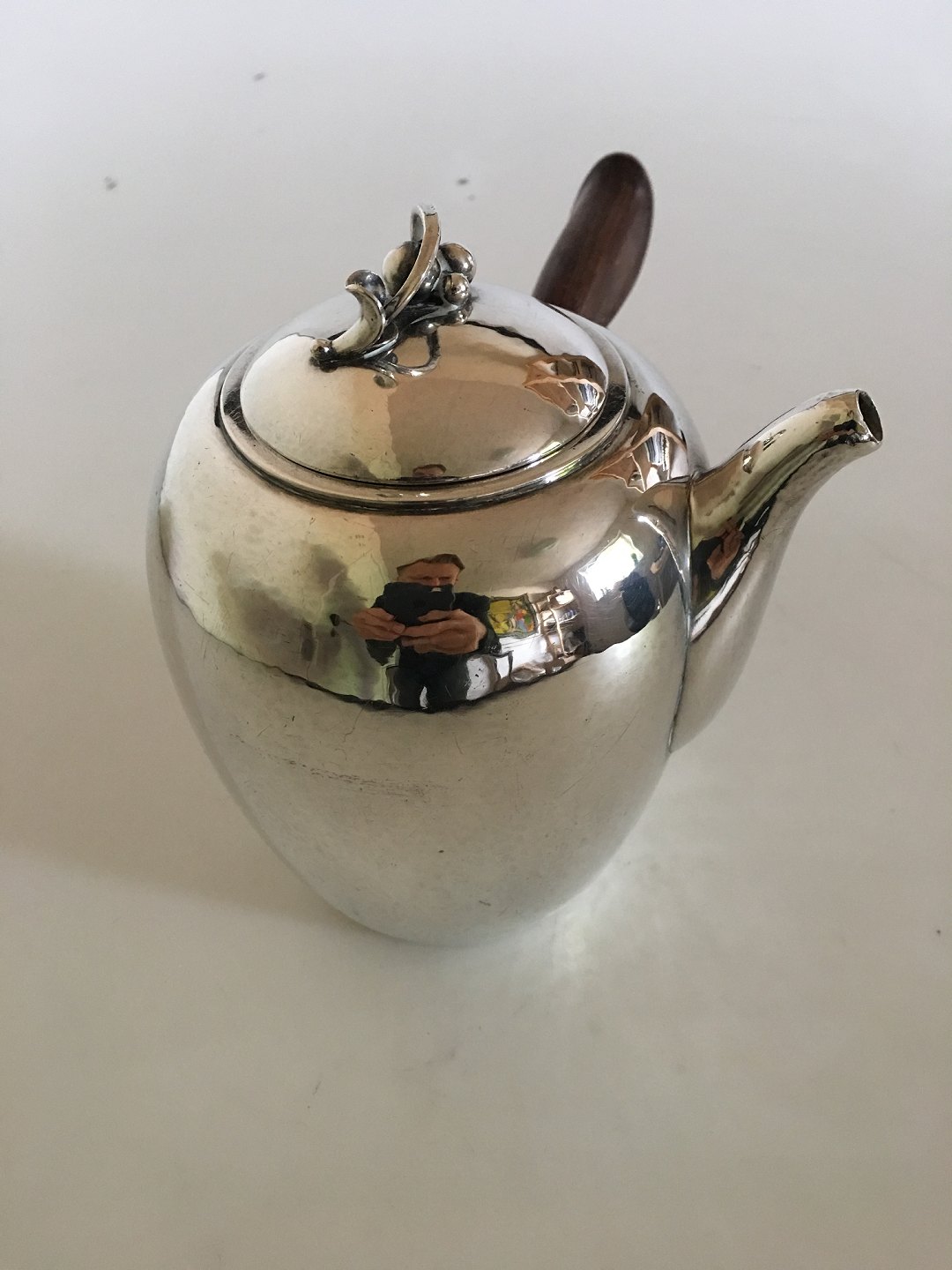 Georg Jensen Sterling Sølv Kaffekande No. 875 med Træhåndtag. Designet af Harald Nielsen. Fra 1943 stemplet Georg Jensen & Wendel. 14.5 cm Høj. 1 L. Vejer 505 gram.