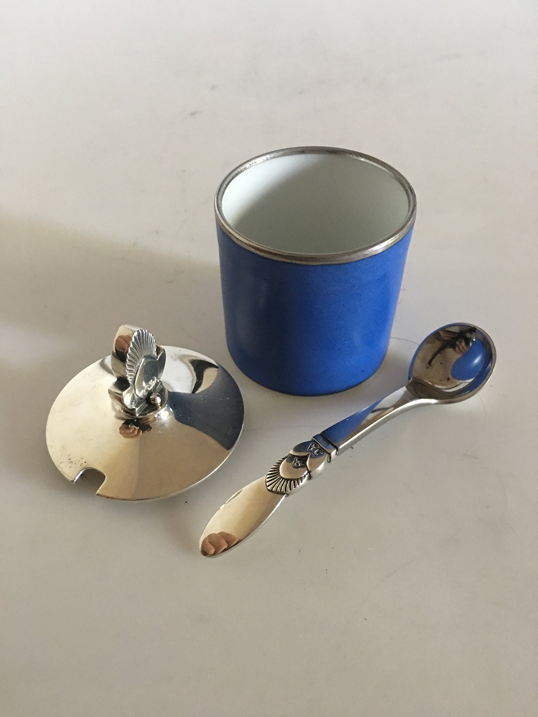 Georg Jensen / Royal Copenhagen Sennepskrukke No. 8073 med Kaktus Sterling Sølv Låg No. 815C og Kaktus Sennepsske. Krukken er 4.5 cm Høj. Låget måler 4.5 cm diameter. Låg og ske vejer tilsammen 37 gram. Produceret efter 1945.