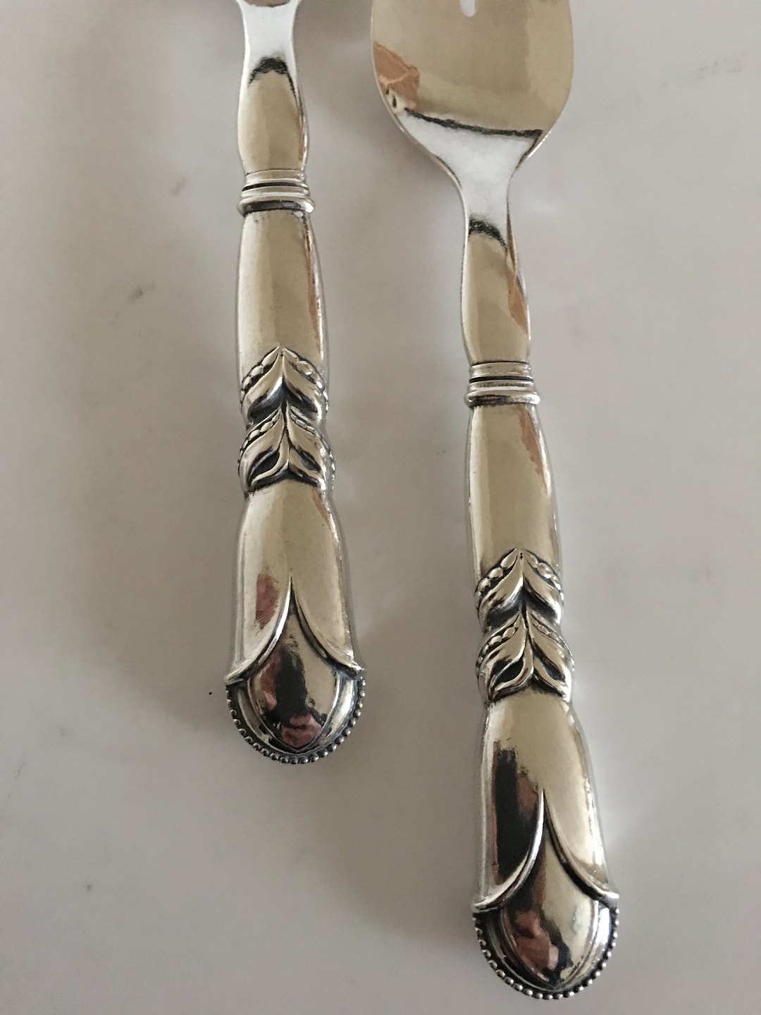 Georg Jensen Sterling Silver Ornamental Serving Set No. 57. Spoon and Fork measures 22 cm L (8 21/32"). Manufactured after 1945.