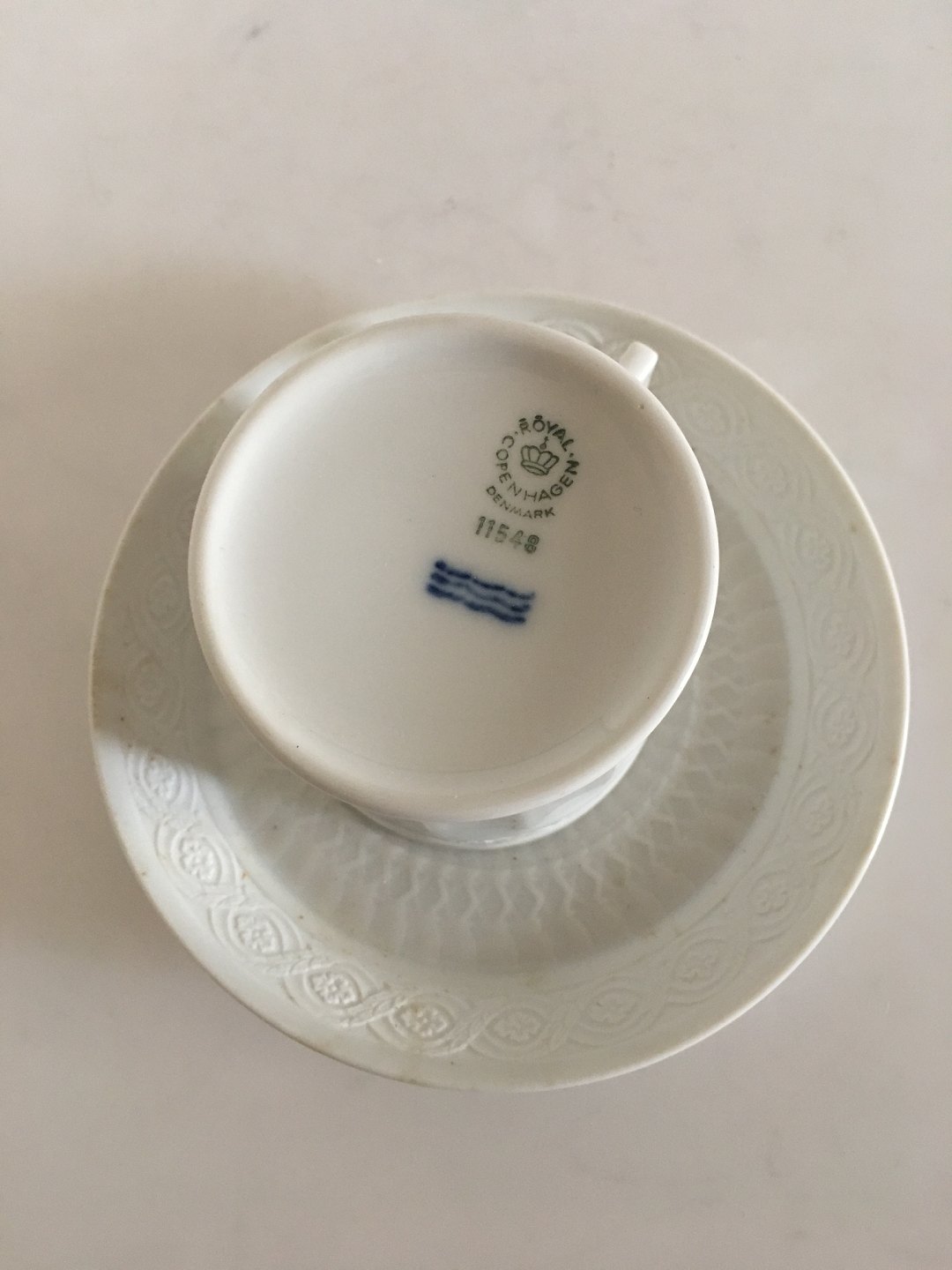 Royal Copenhagen Hvid Vifte Mokkakop og Underkop No. 11548. Kop måler 5,5 cm x 6 cm / 2,16 in. x 2,36 in. Underkop 12,5 cm / 4,92 in.