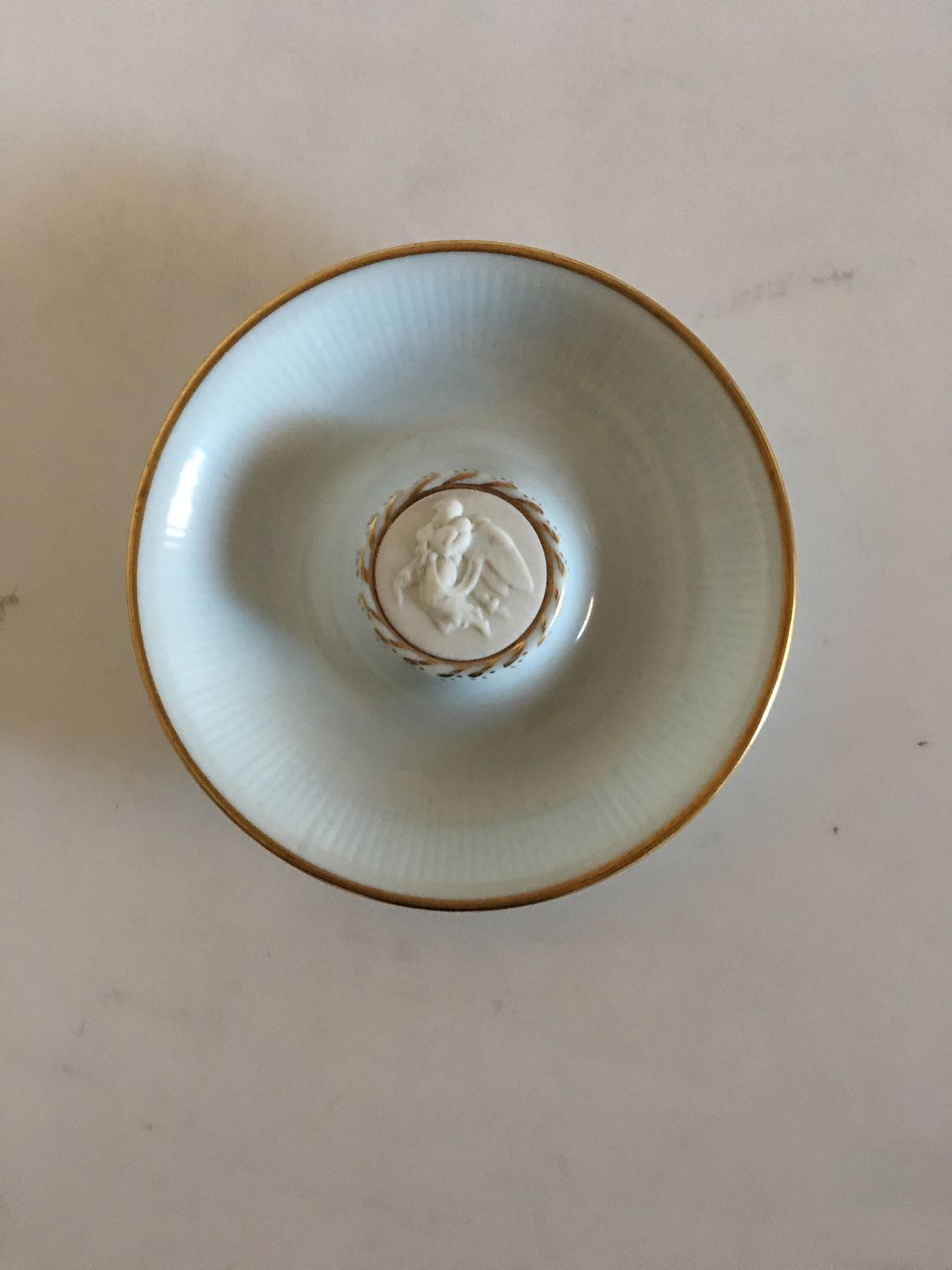 Bing & Grondahl Ashtray No. 1291 with Bisque Angel Ornament and Gold Border. Measures 12 cm diameter (4 23/32"). In nice condition.