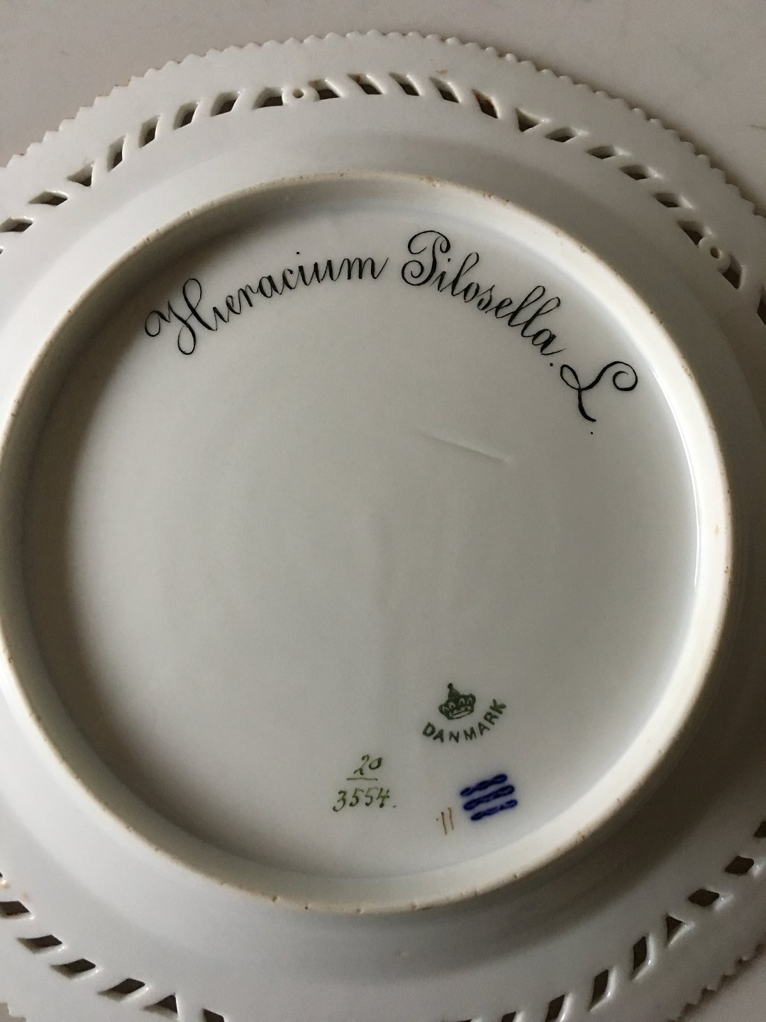 Royal Copenhagen Flora Danica Frokosttallerken med Gennembrudt Kant No. 20/3554. Tallerkenen har et lille skår på en af takkerne som er malet over med guld, så det ikke er så tydeligt at se. 22.5 cm diameter.