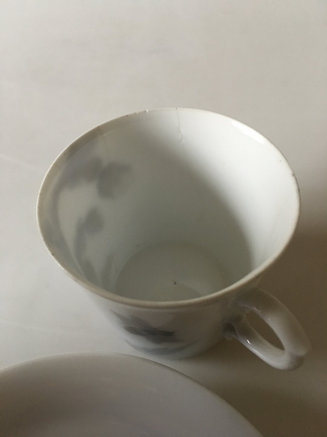 Royal Copenhagen Art Nouveau Mokka Kop med Underkop. Koppen har to Hårrevner og et lille skår på kanten. Underkoppen i fin hel stand. Kop måler 5.2 cm H. 5.8 cm dia.