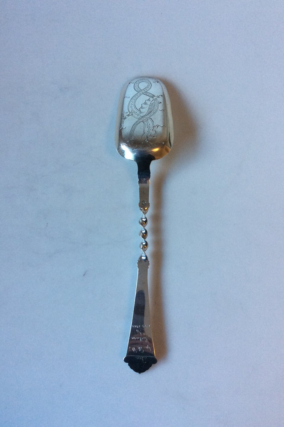Strawberry Spoon in Silver and gilt. Measures 27.5 cm / 10 53/64". Weighs 86 g./ 3.05 oz. Marked P.O. Engraved and Dragon on the back