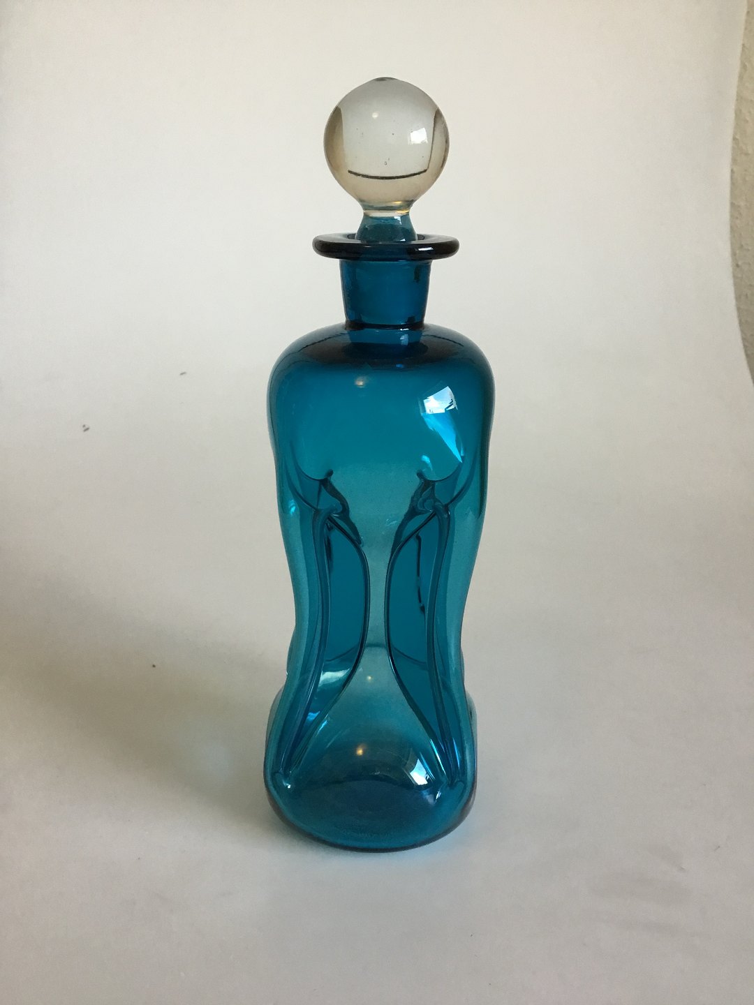 Holmegaard / Kastrup Glassworks Kluk Kluk Decanter in Blue Glass with Clear Bottle Lid. 26.5 cm / 10 7/16" H. In fine condition.