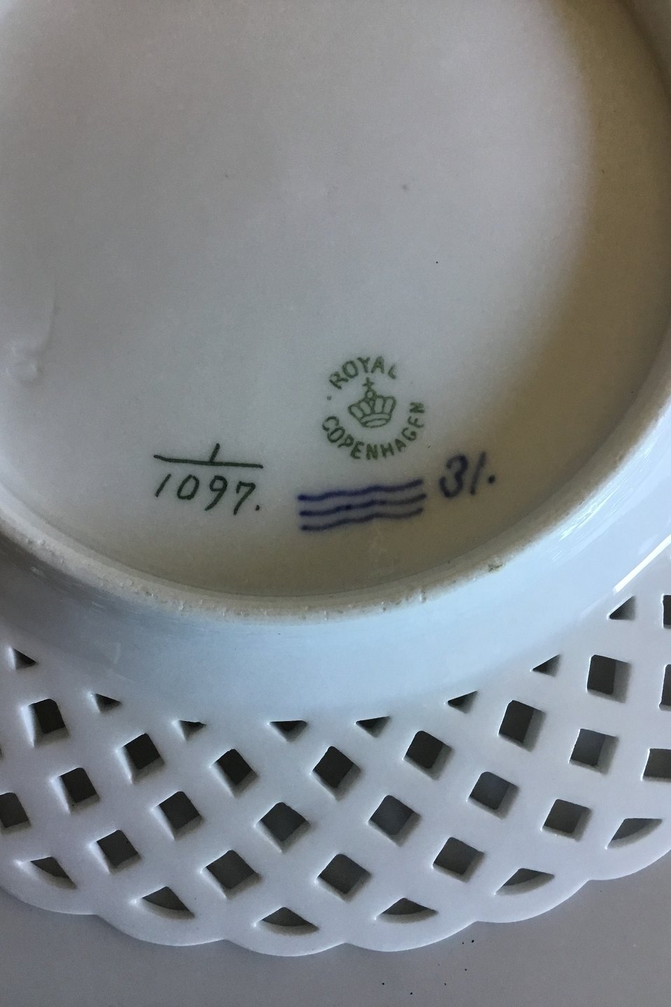 Royal Copenhagen Musselmalet Helblonde med gennembrudt kant Flad Tallerken No 1/1097. Måler 23 cm