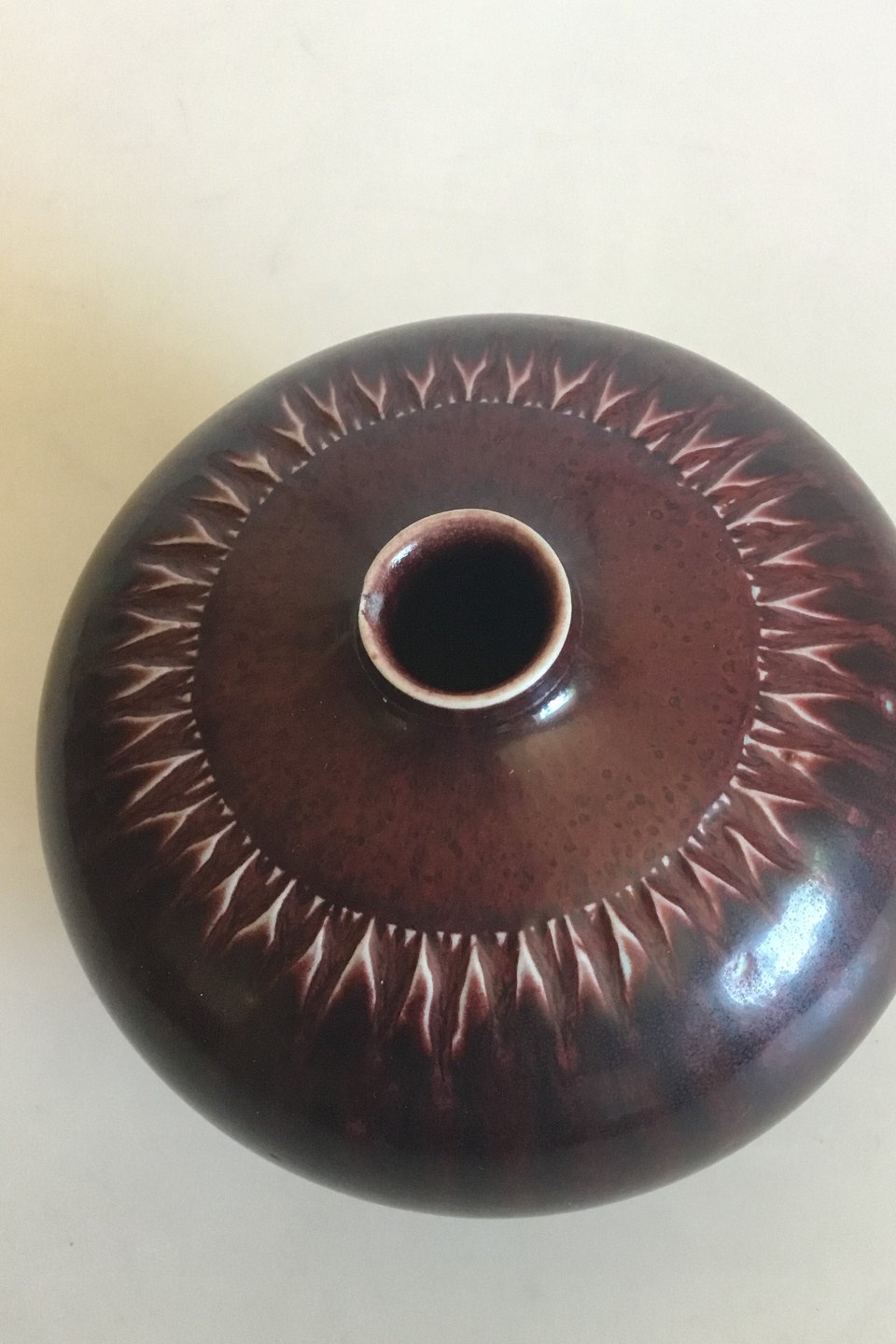 Royal Copenhagen Vase i stentøj med mørkerød glasur. Designet af Gerd Bøgelund. Måler 13,4 cm dia. x 10,8 cm høj. Lille afslag på kanten.