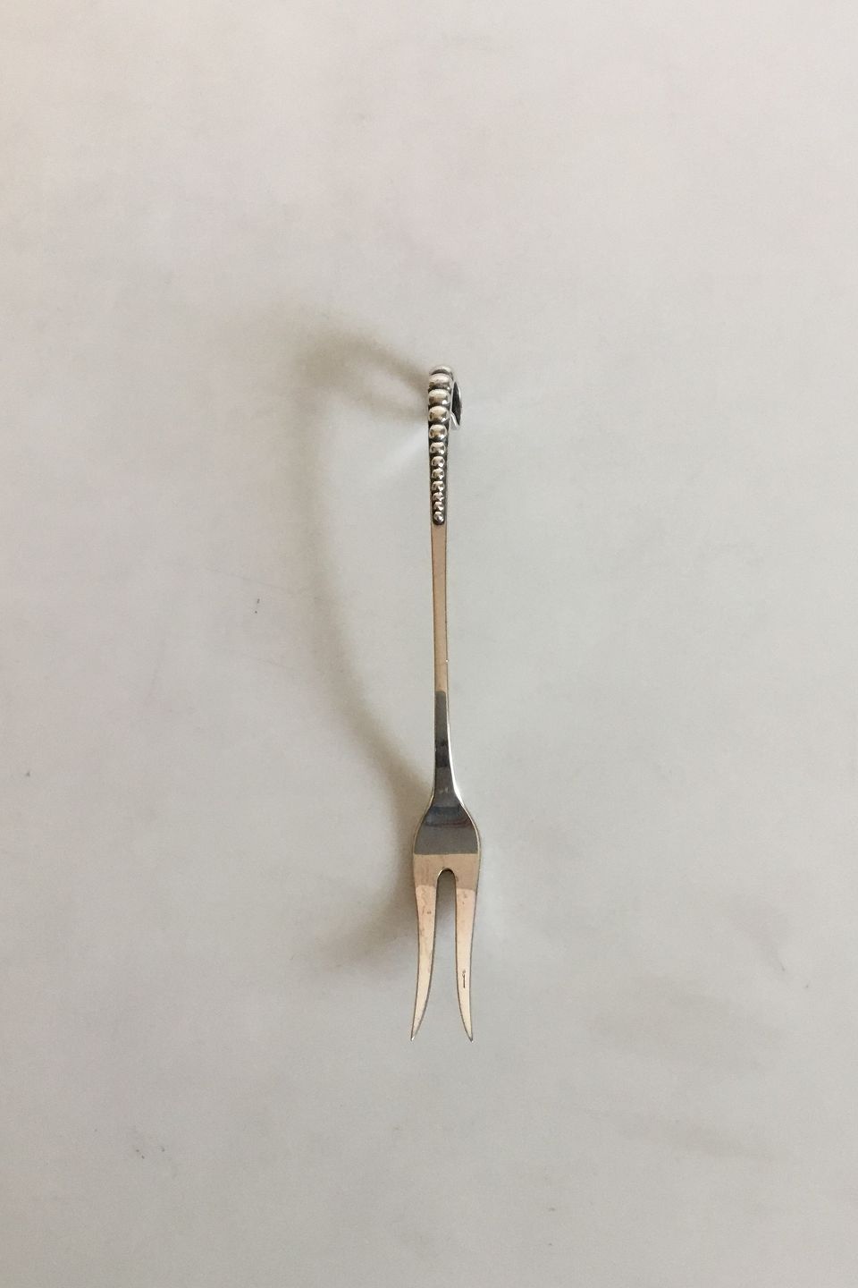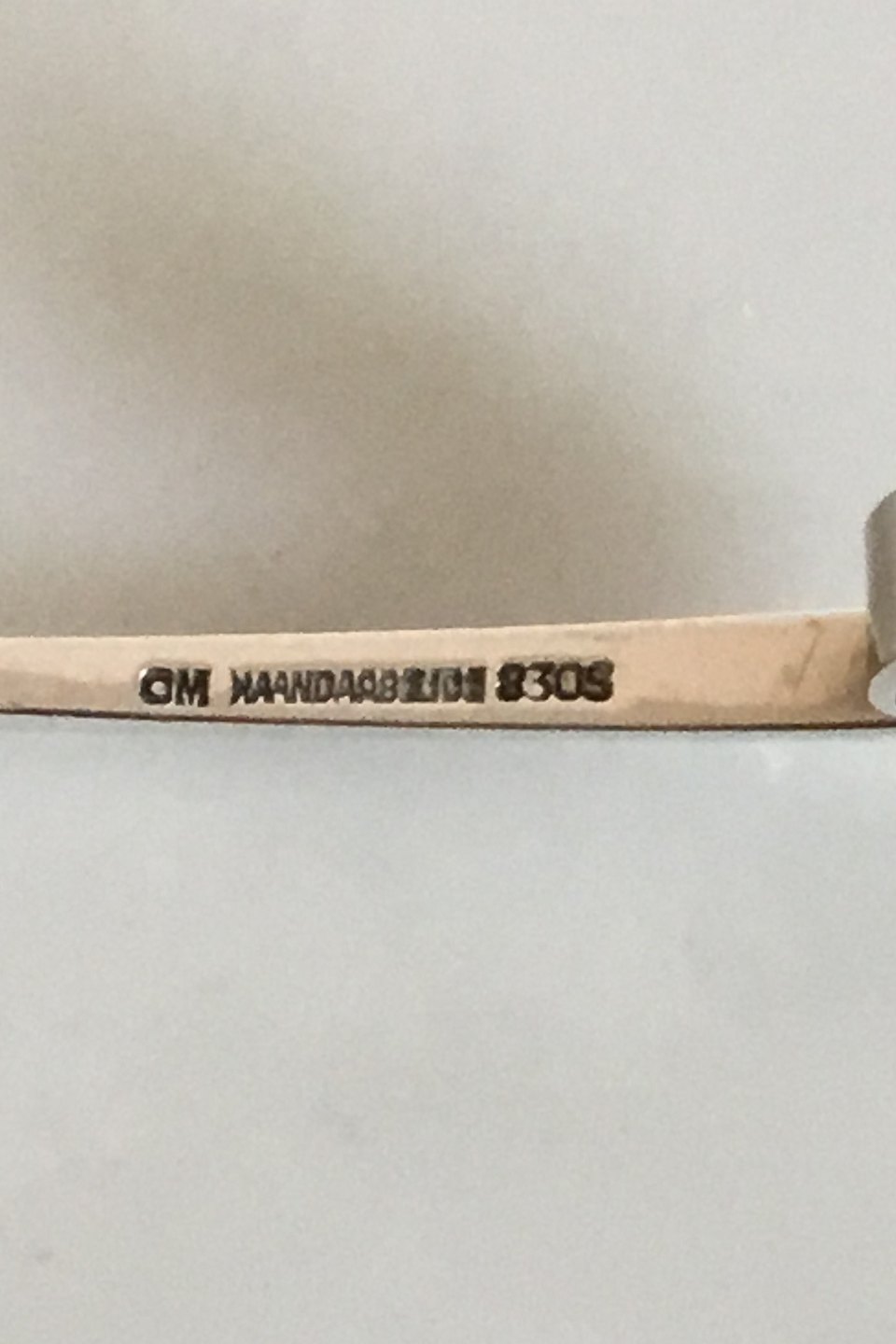 Pålægsgaffel i sølv. Stemplet OM, Haandarbejde. Måler 13,3 cm