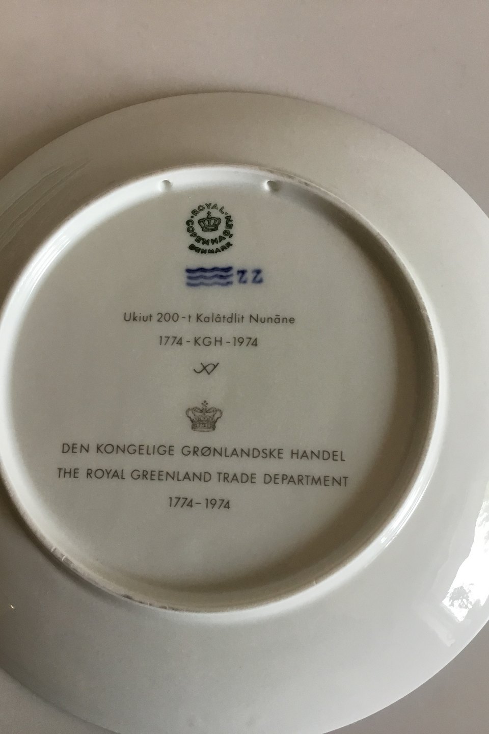 Royal Copenhagen plate for KGH The Royal Greenland Trade 200 years (1774-1974). Designed by Sven Vestergaard. Measures 20.5 cm / 8 5/64 in.