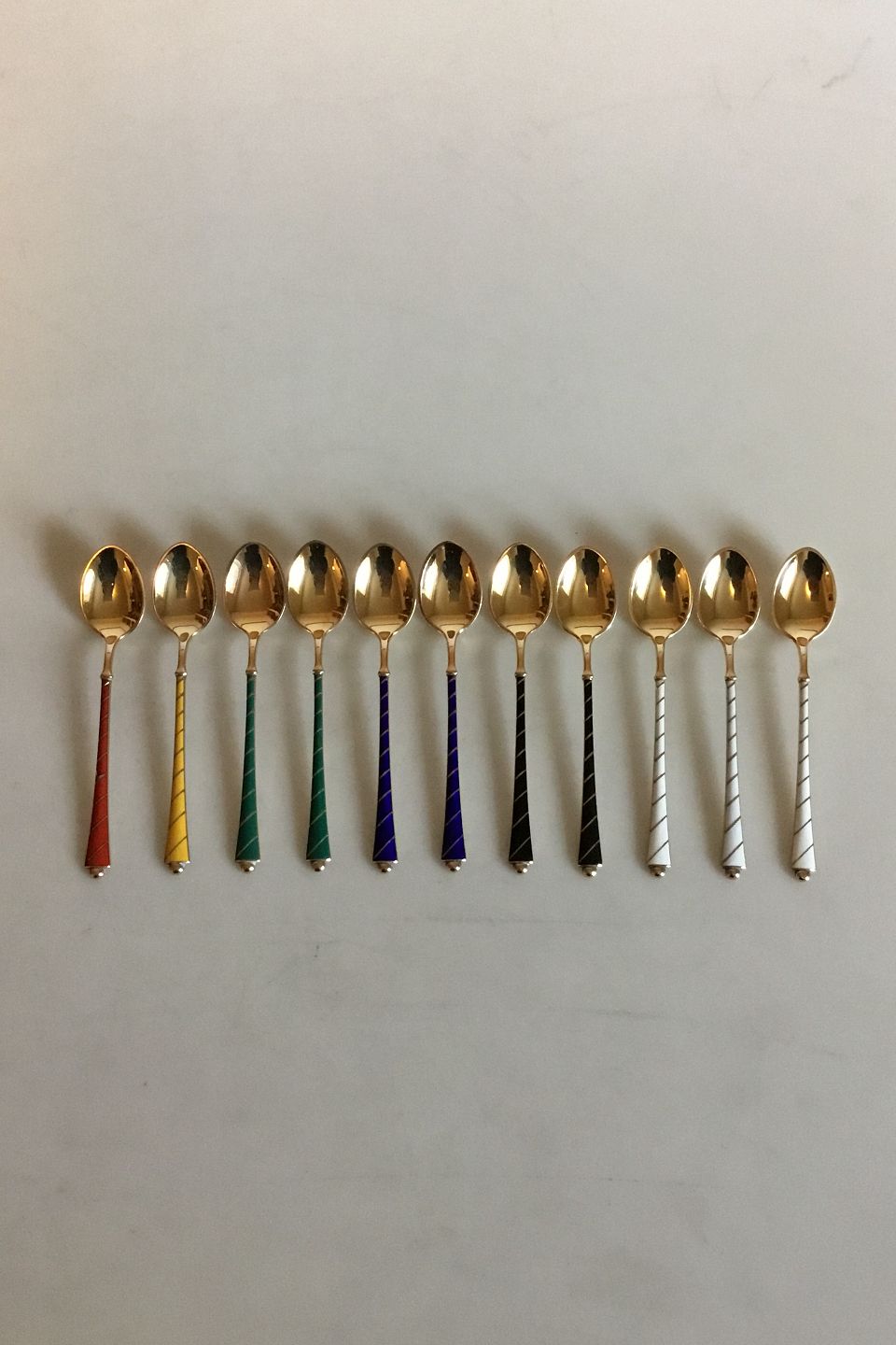 ELA Danmark Sæt på 6 stk. Mokkaskeer i forgyldt Sterling Sølv med farvet emalje. Måler 9,3 cm