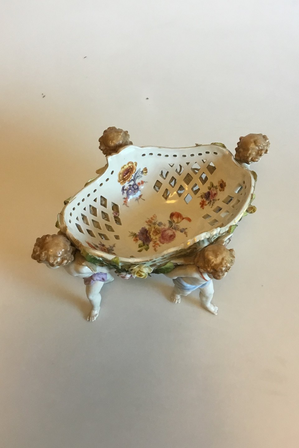 Large tableware made of porcelain, richly modeled and adorned with pousing flowers, decorated in colors and gold, carried by four putti. Plaue mark from 1916. Measures 31 cm / 12 13/64 in. x 16 cm / 6 19/64 in. Chip on one foot