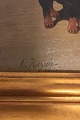 Painting, oil on canvas in gold frame, of dogs (dachshund). Signed A. Ritzau 1916. Measures 35 cm / 13 25/32 in. x 44 cm / 17 21/64 in.
