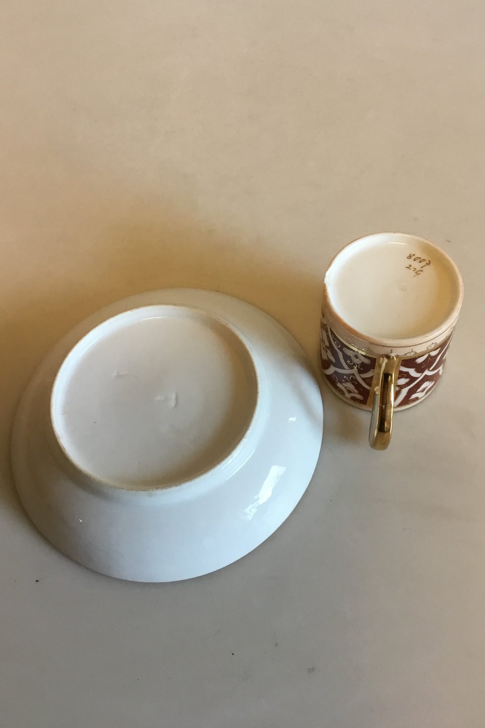 Carl Tielsch / Altwasser Mokkakop dekoreret med blomsterfrise i rødt og guld. Fra 1875-1909. Måler kop: 5,1 cm x 5 cm dia. Underkop: 12 cm dia. Kop med afslag på underkanten