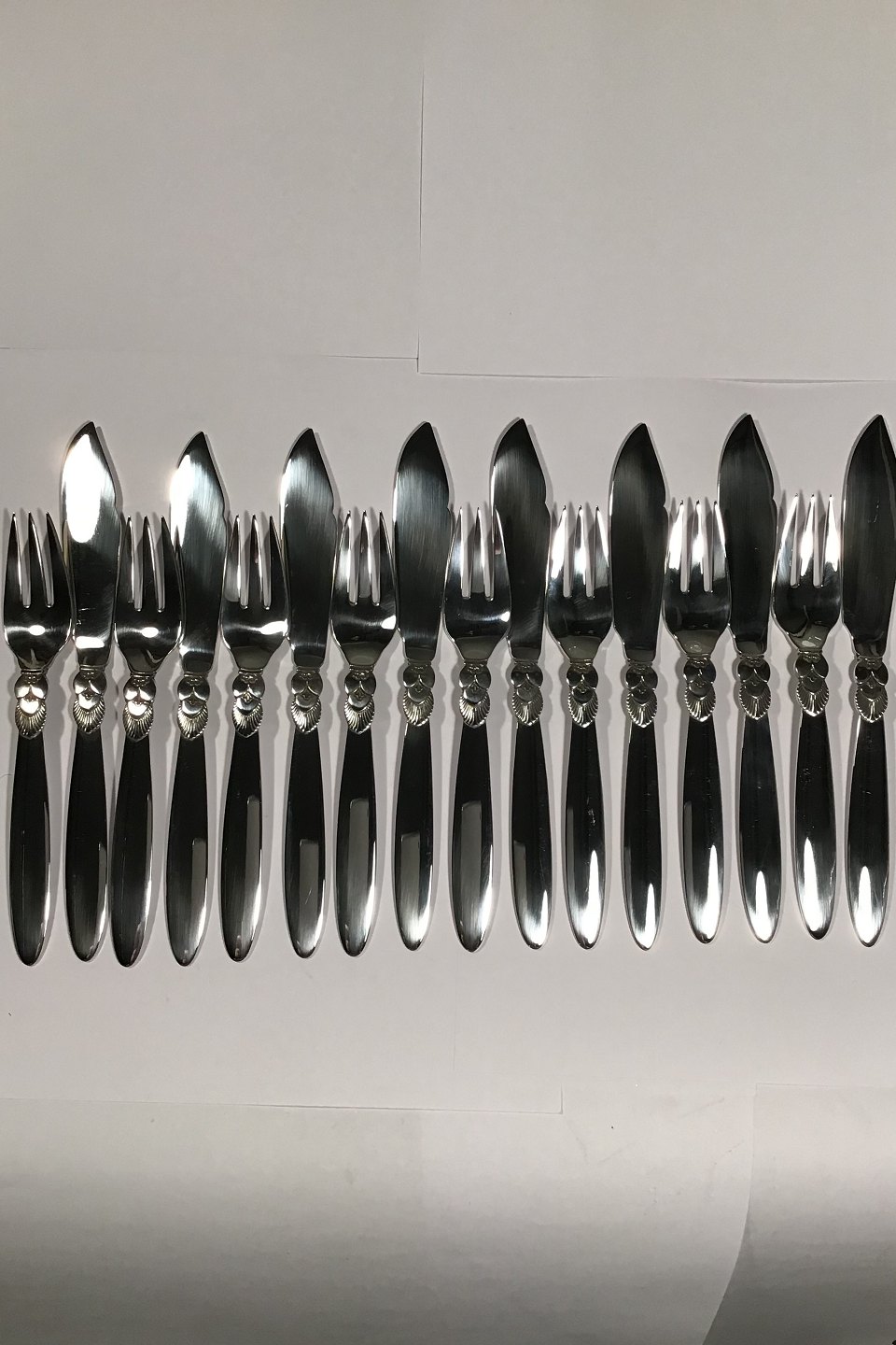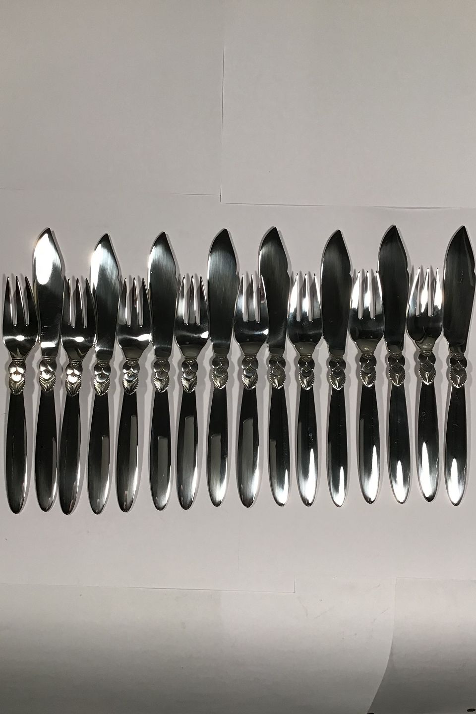 Georg Jensen Sterling Sølv Kaktus Fiskebestik til 8 pers(16 dele) No 061 Gaffel 16.2 cm No 062 Kniv 19.5cm