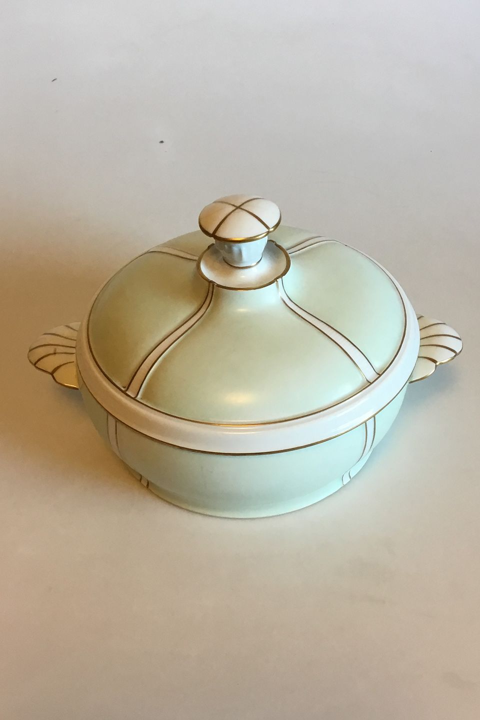 Bing & Grøndahl Stel med grøn dekoration med guld på form 507(Herregaard) Rund Terrin med låg. Måler 21 cm dia. x 15,5 cm