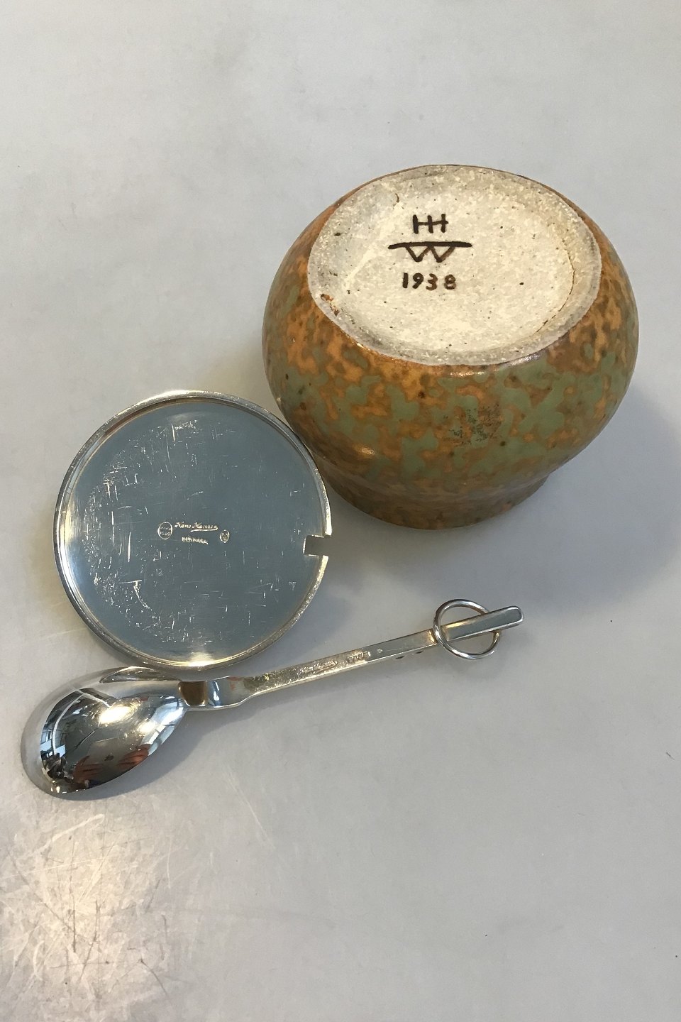 Bode Willumsen Hans Hansen Jam Jar Sterling Silver Lid and Spoon Jam Jar made of stoneware decorated with bird egg glaze in golden shades. Underneath sign. Bode Willumsens and Hans Hansens monogram 1938, lid and spoon of Sterling Silver made at Hans Hansen af Karl Gustav Hansen, lid hallmarked 1939. H. 8,5 cm.(3.34 in) incl. finial, Diam 10 cm(3.93 in) Inside with hairline